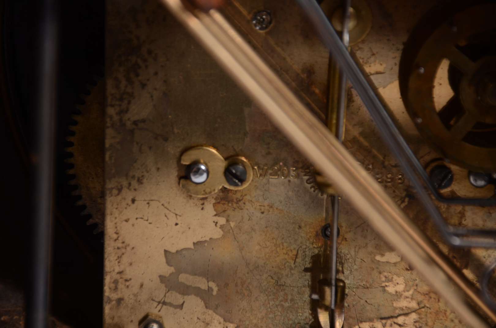Relógio de mesa de bronze decorado com guirlandas florais, mostrador com algarismos romanos. Máquina parada.