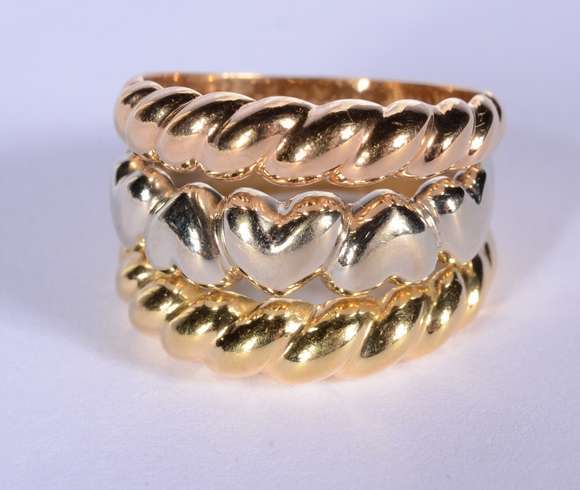 Anel de ouro 18 k., contraste 750 mls feitio torcido nas laterais e corações em ouro branco, aro 18. (Por motivos de ...