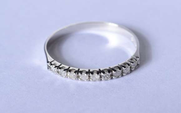 Meia aliança de ouro branco cravejado com 10 brilhantes, aro 14. (Por motivos de segurança a peça não se encontra na ...