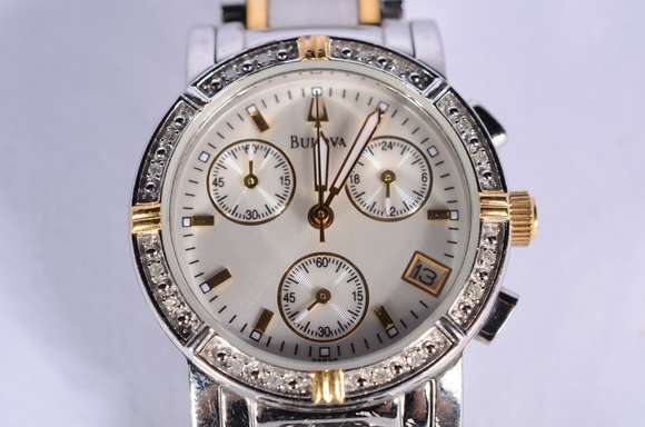 Relógio feminino de aço com 16 diamantes, á quartz com cronógrafo. No estojo e acompanha certificado.