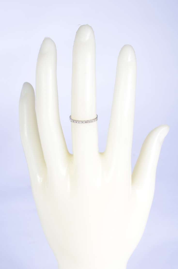 Aliança completa de ouro branco cravejada com mini brilhantes, aro 14. (Por motivos de segurança a peça não se encon...
