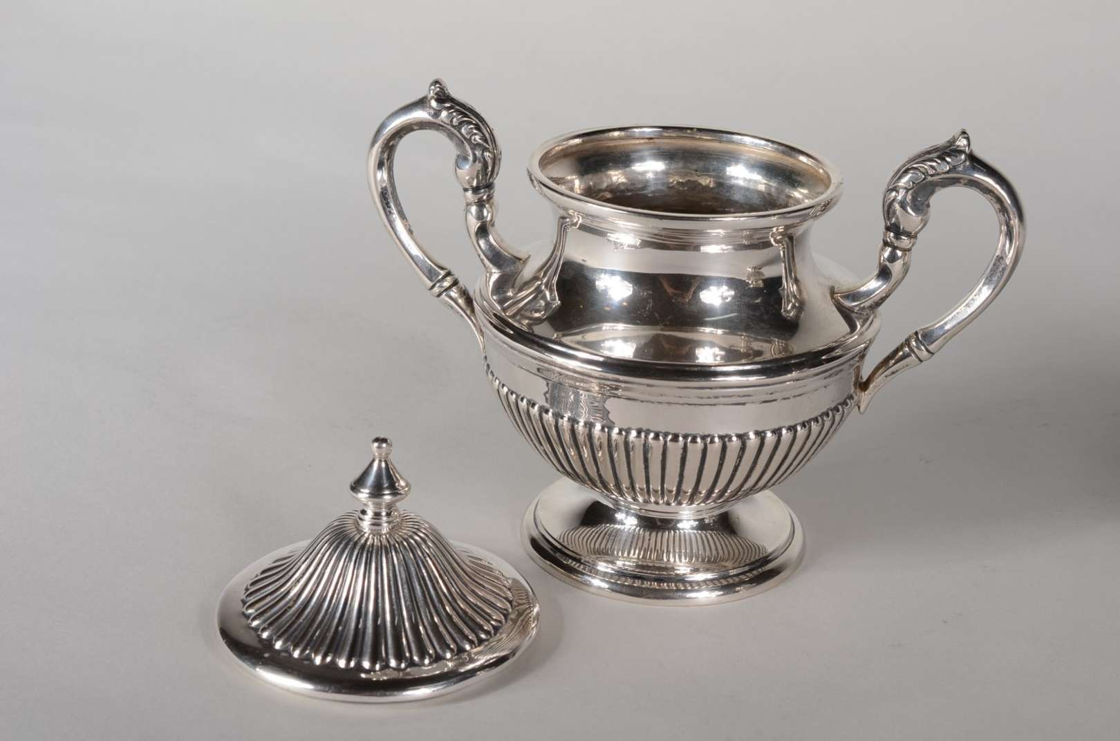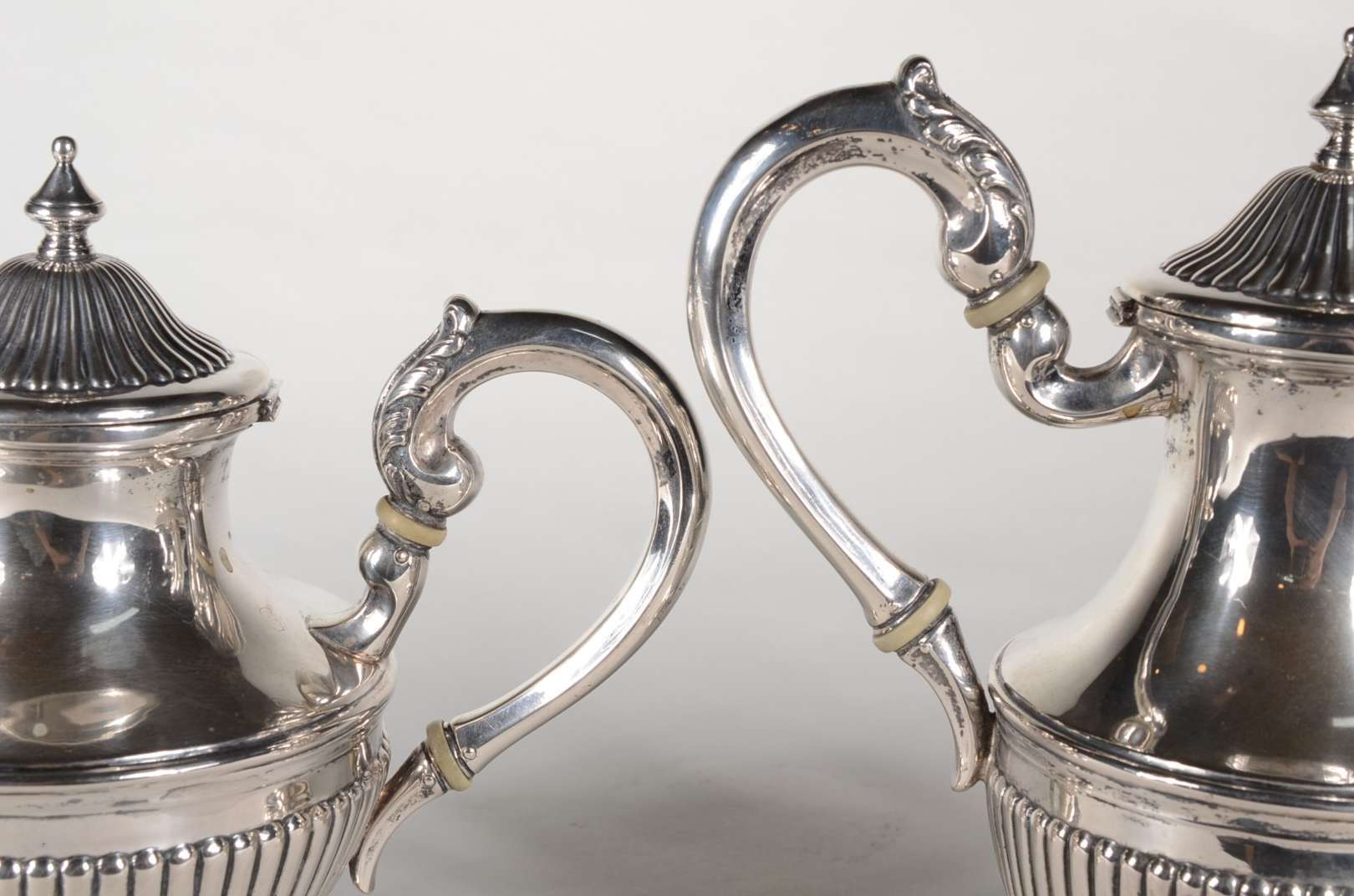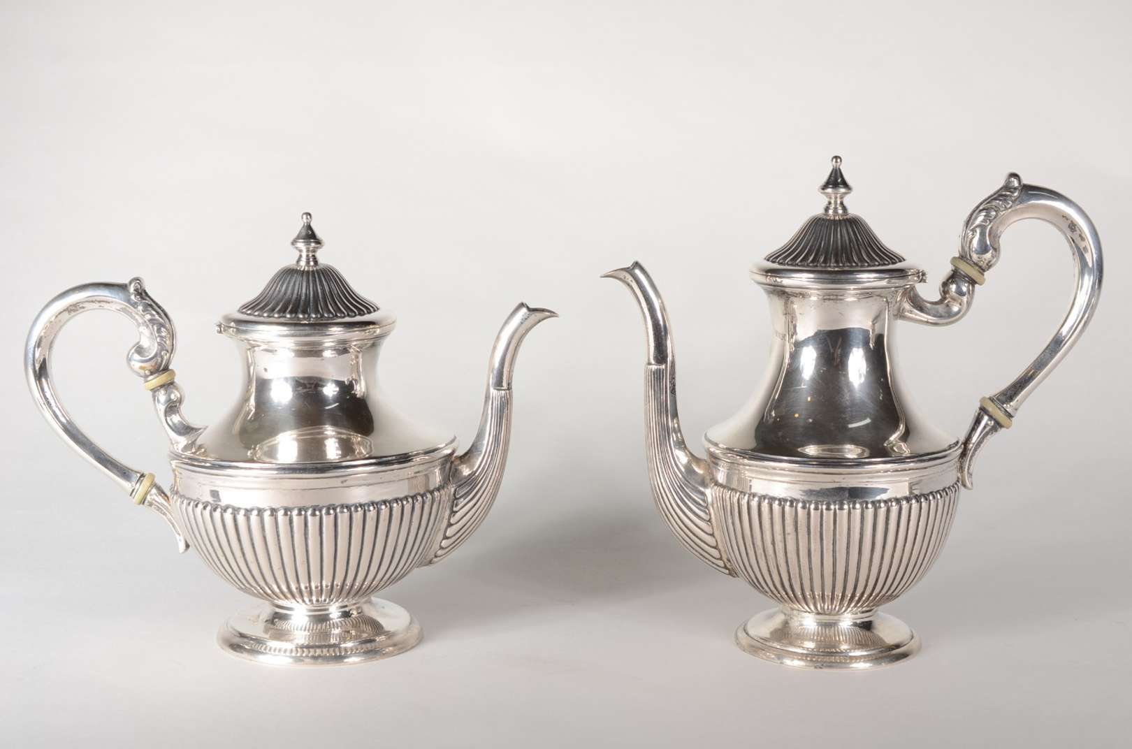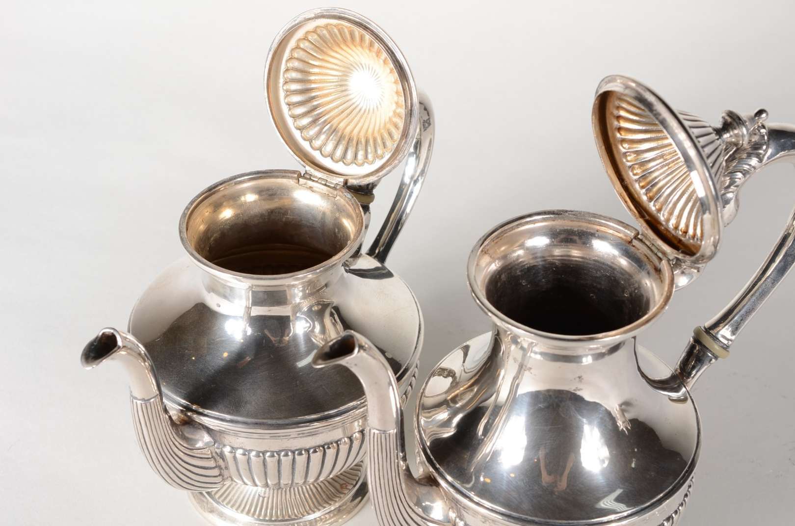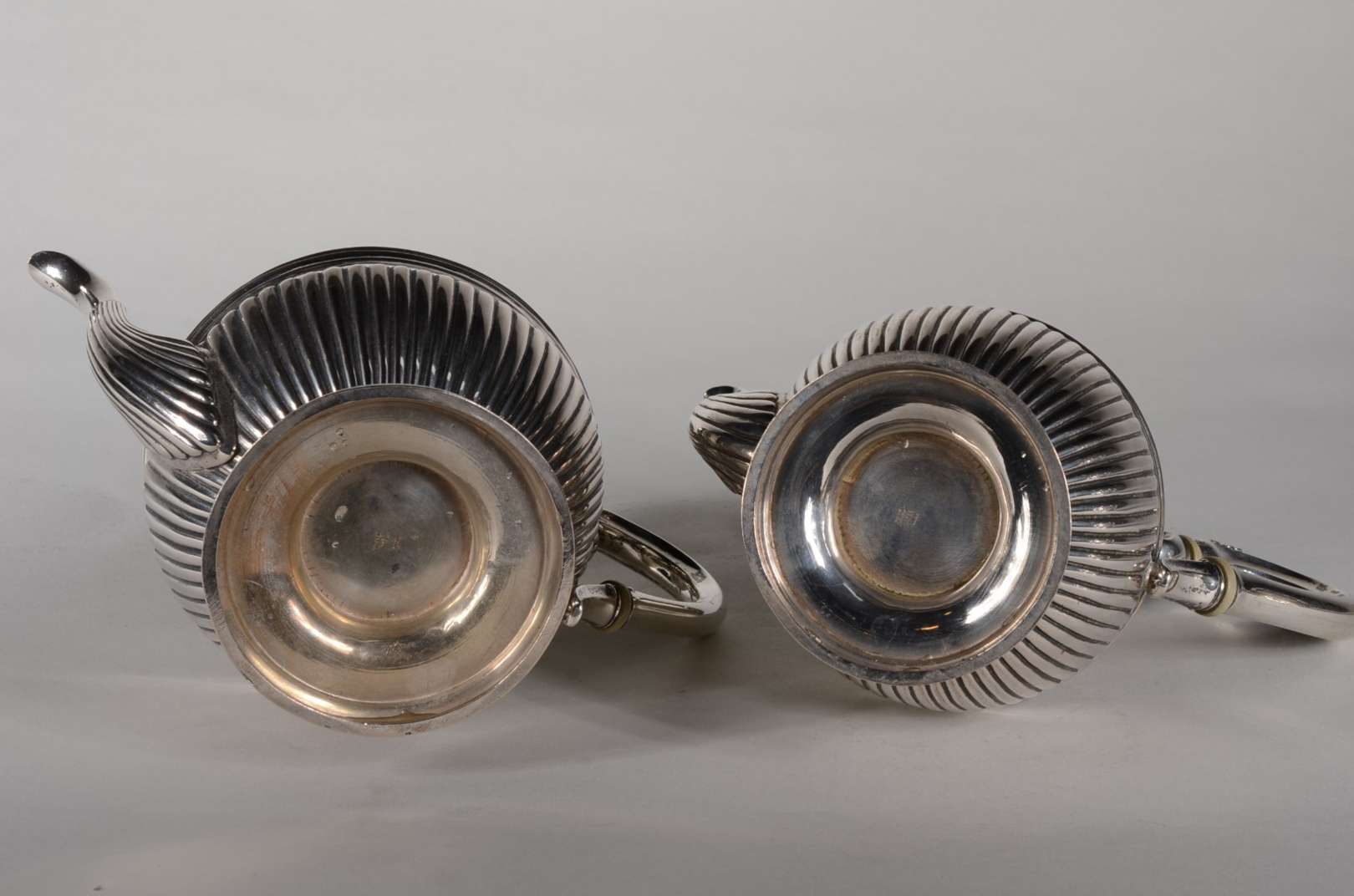 Bule de prata inglesa contraste leão passante, alça de madeira, pega da tampa na forma de pinha sobre placa articulad...