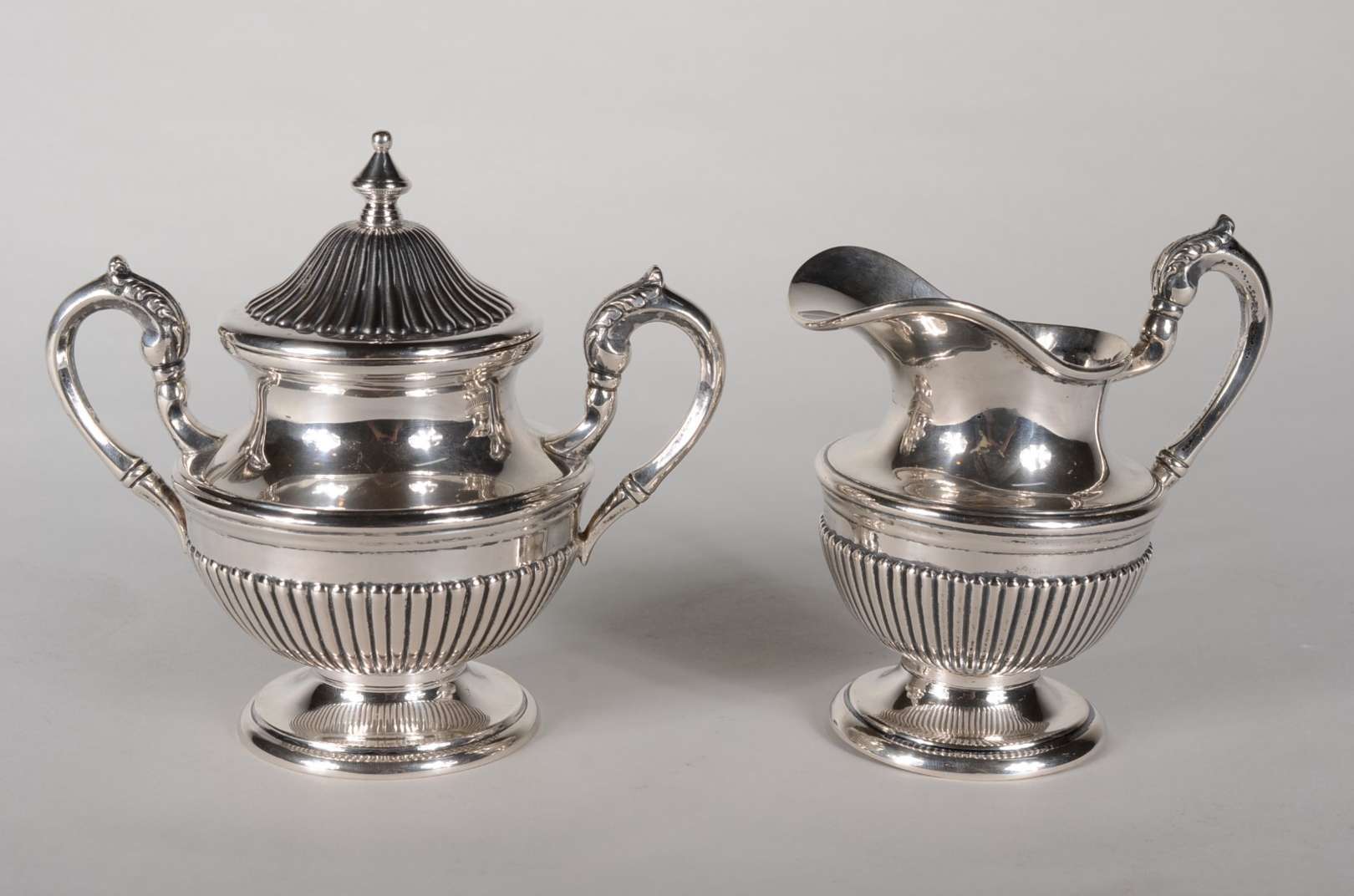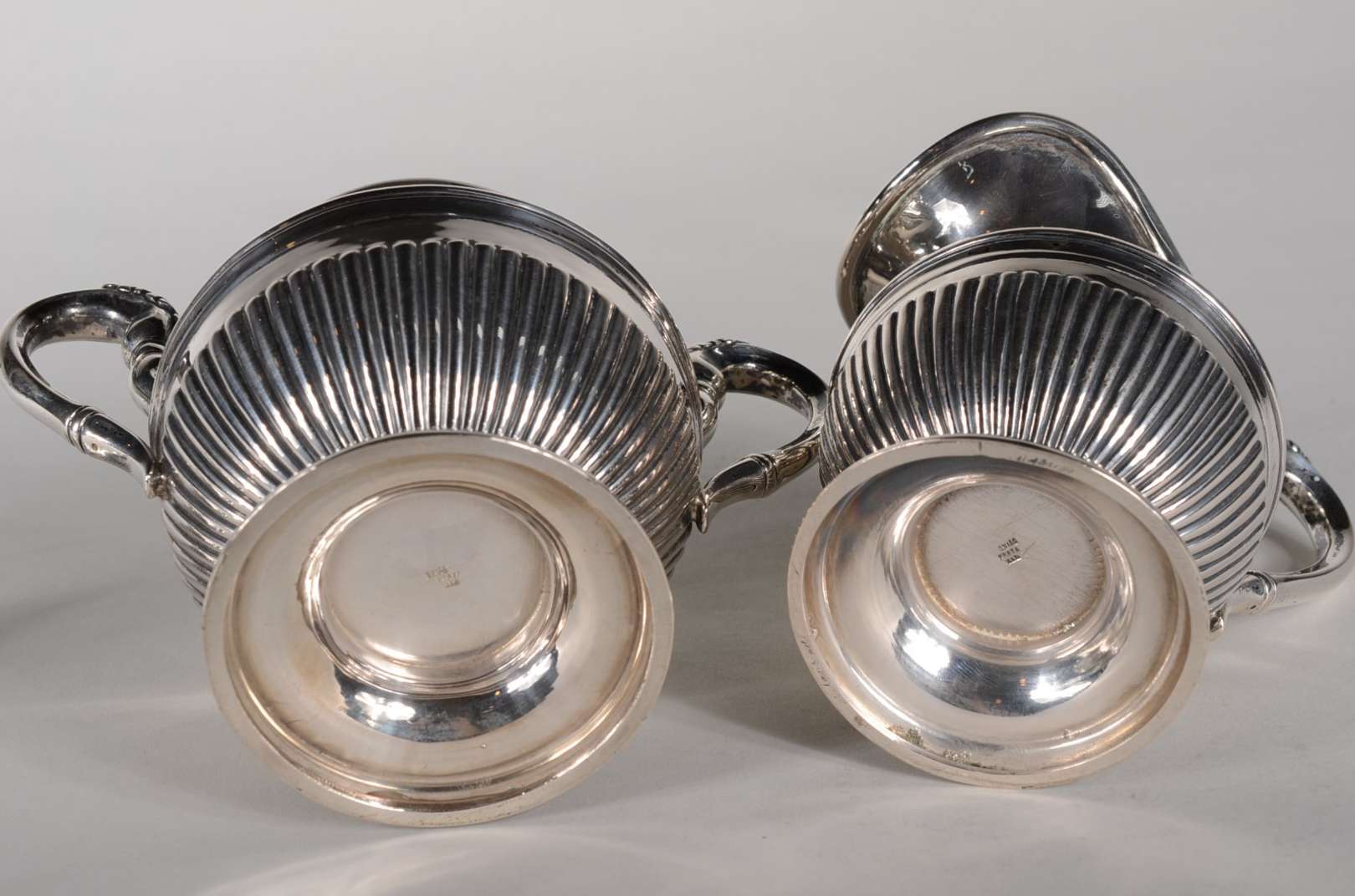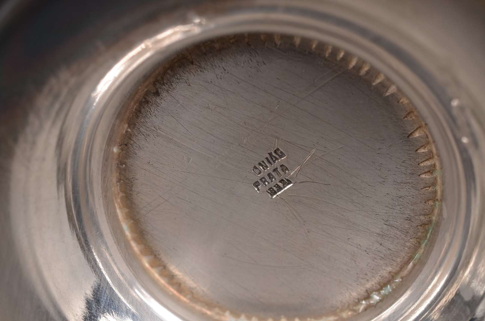Duas peças de prata de lei, sendo: Base para galheteiro e pequeno prato (pequenos defeitos). Peso da prata: 380 g. (...