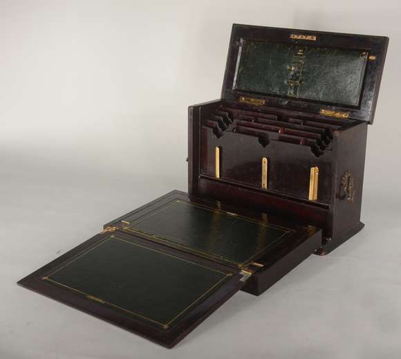 Escrivaninha inglesa de viagem em madeira nobre com marqueterie, tampo e frente articulados, parte interna com escani...