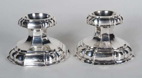Par de castiçais de prata inglesa contraste leão passante, bases recortadas. Peso da prata: 120 g. (Por motivos de s...