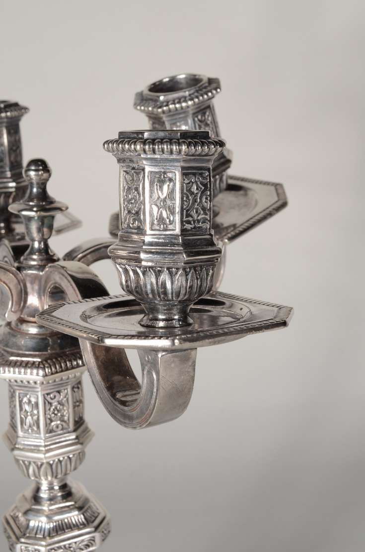 Par de candelabros de prata contrastada para 3 velas cada, pés em forma de concheados. Peso da prata: 1280 g. (Por mo...