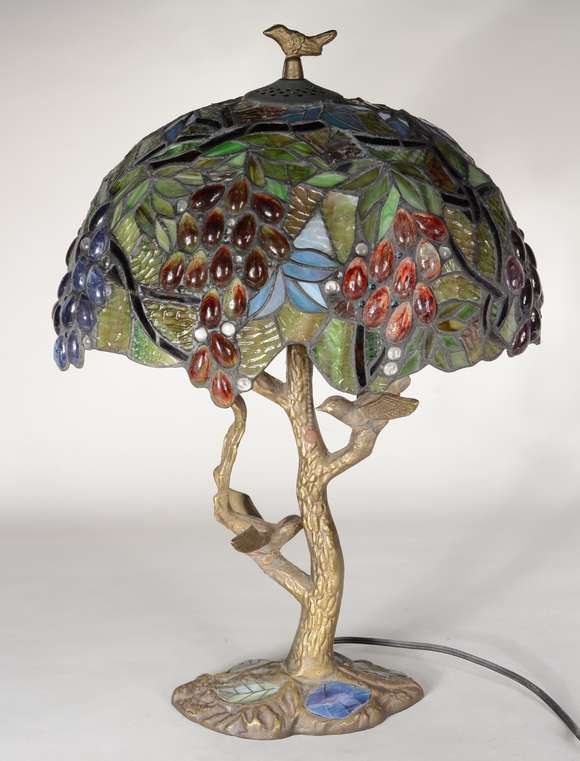 Abatjour com base de metal dourado com pássaros, cúpula com placas de vidro multicor, estilo Tiffanys.