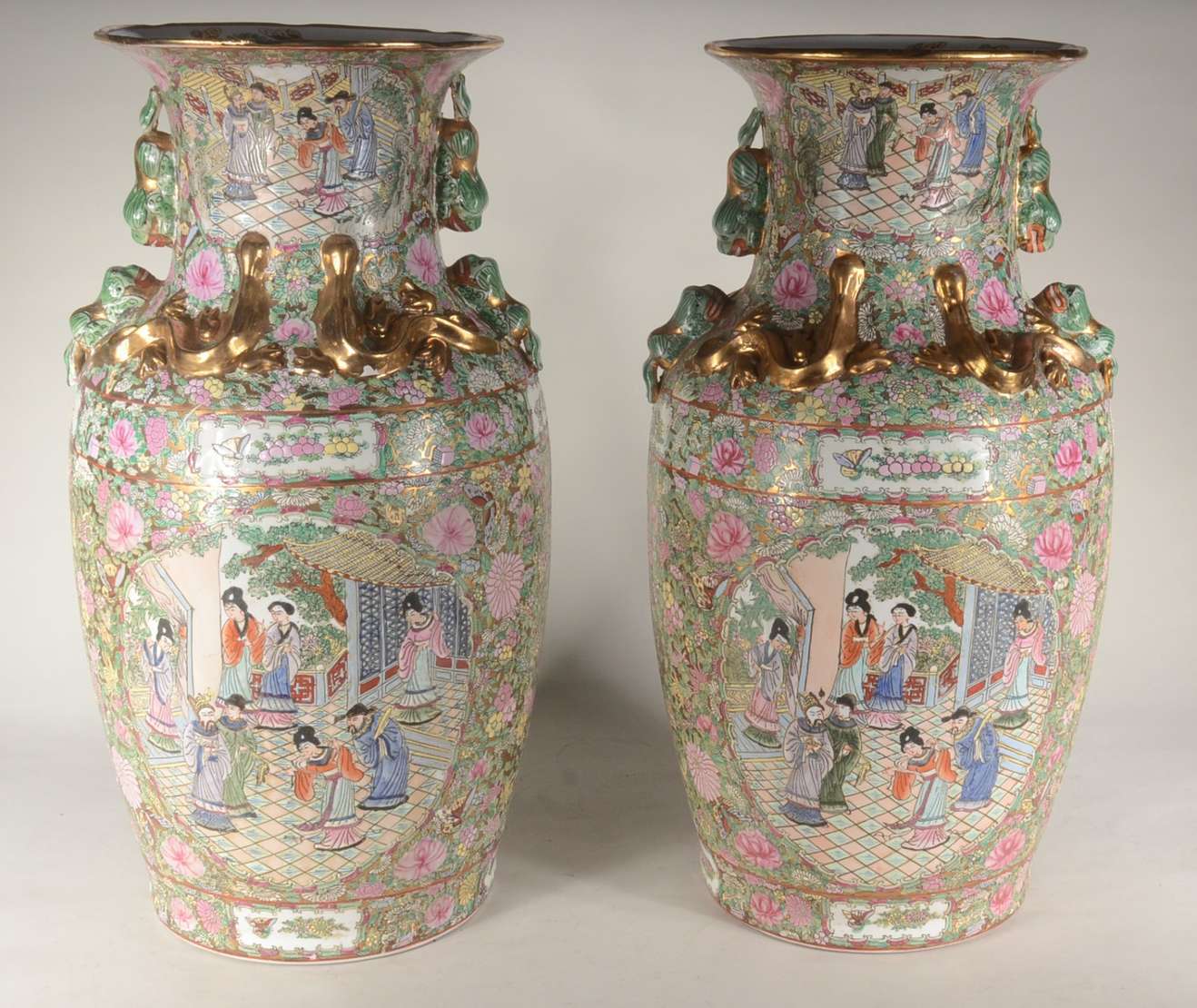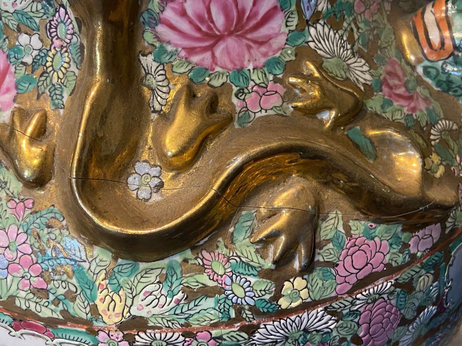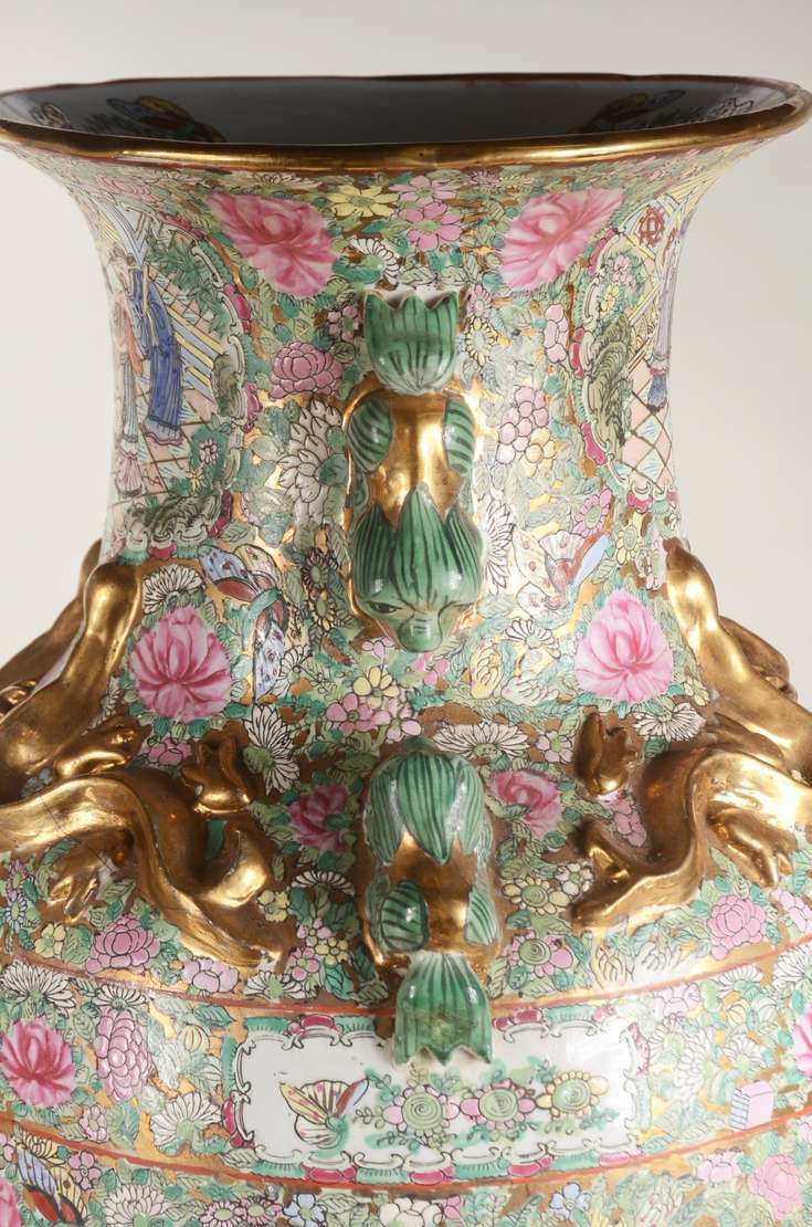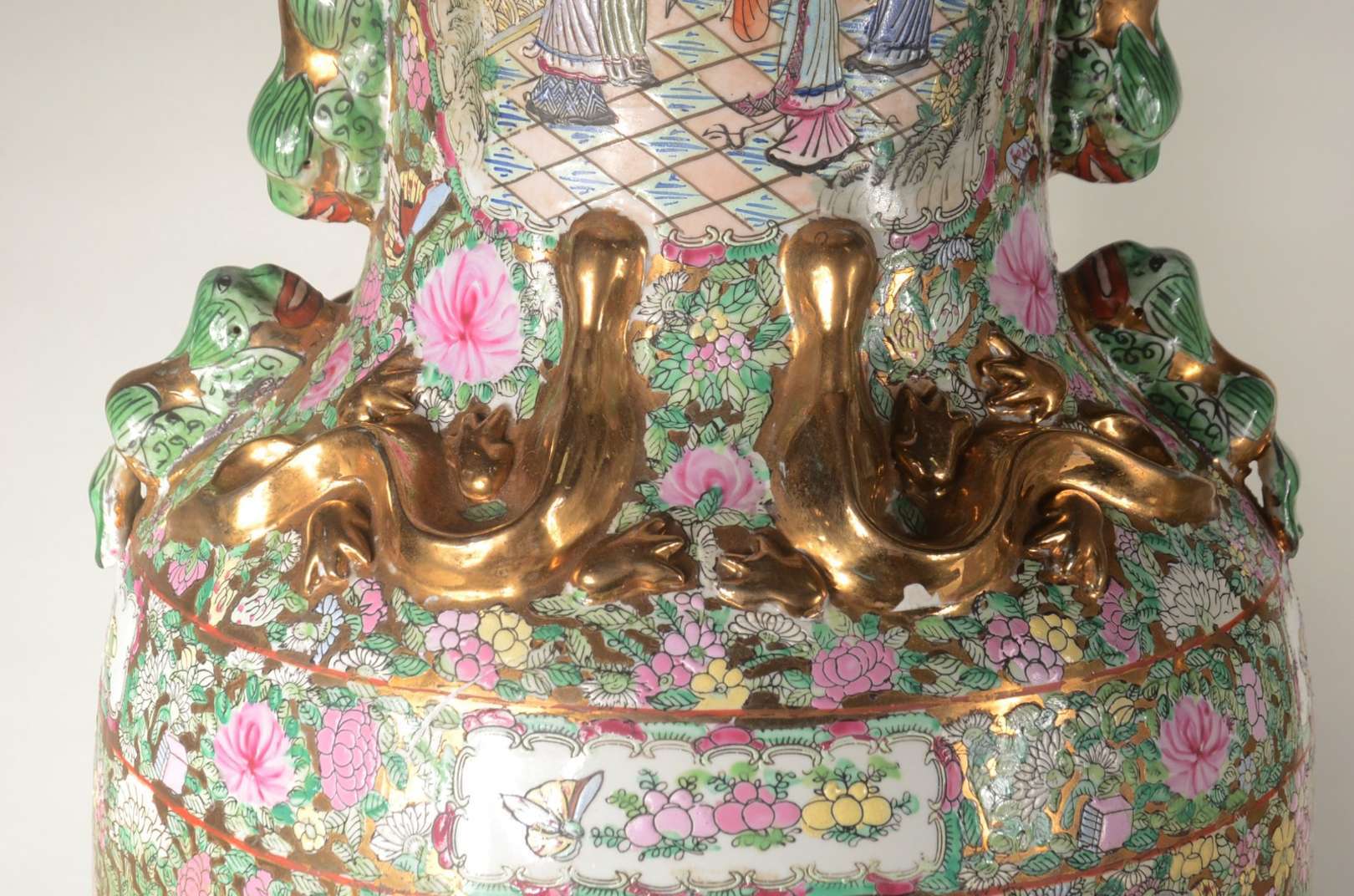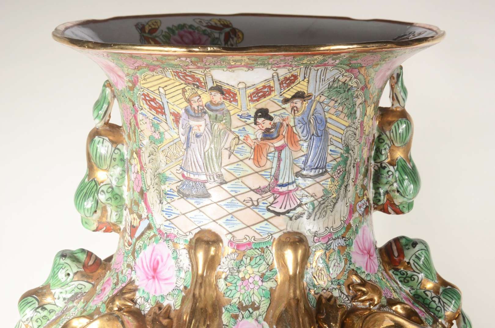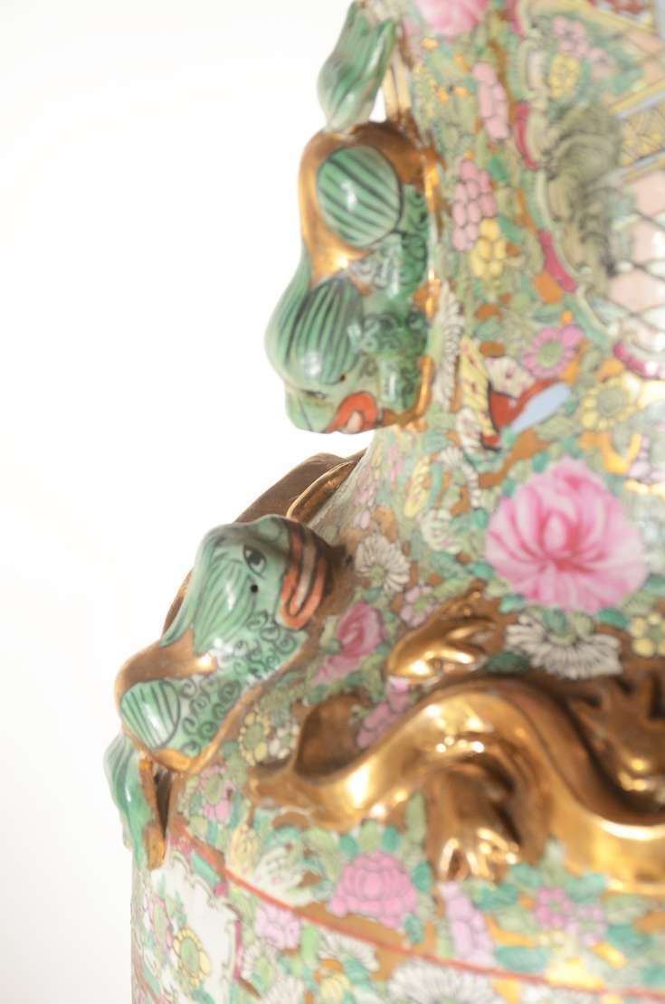Vaso de porcelana oriental decorado com figuras em policromia, pegas laterais na forma de cabeças de animais. Marcado...