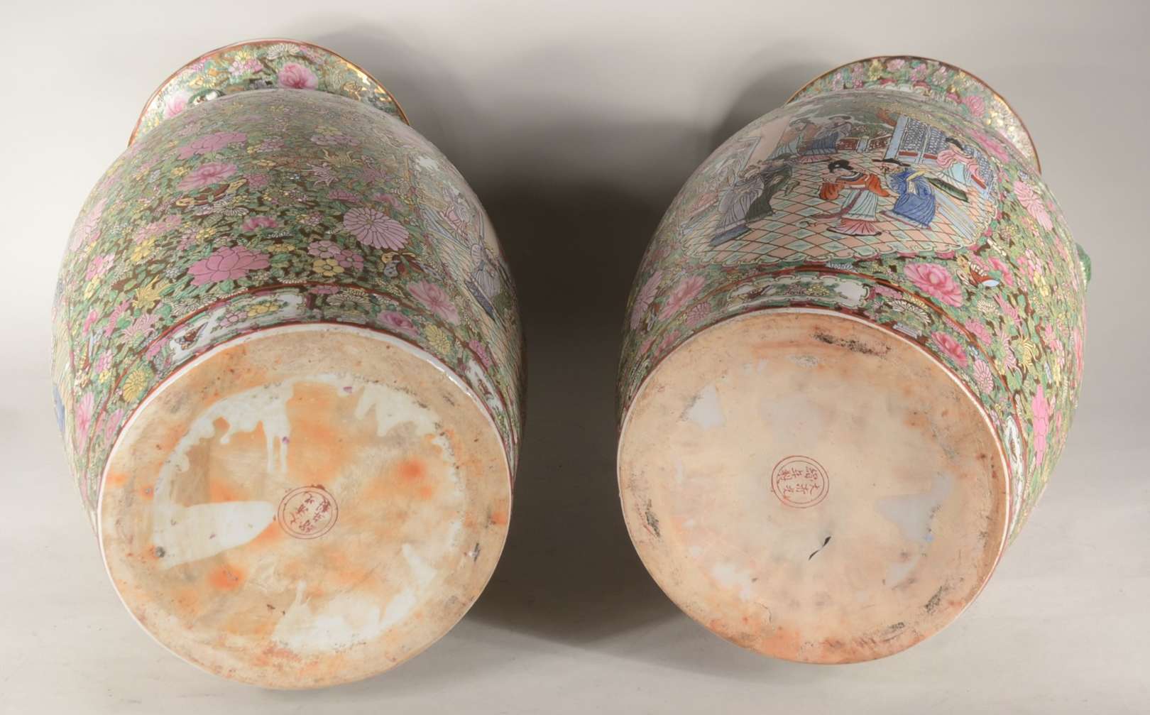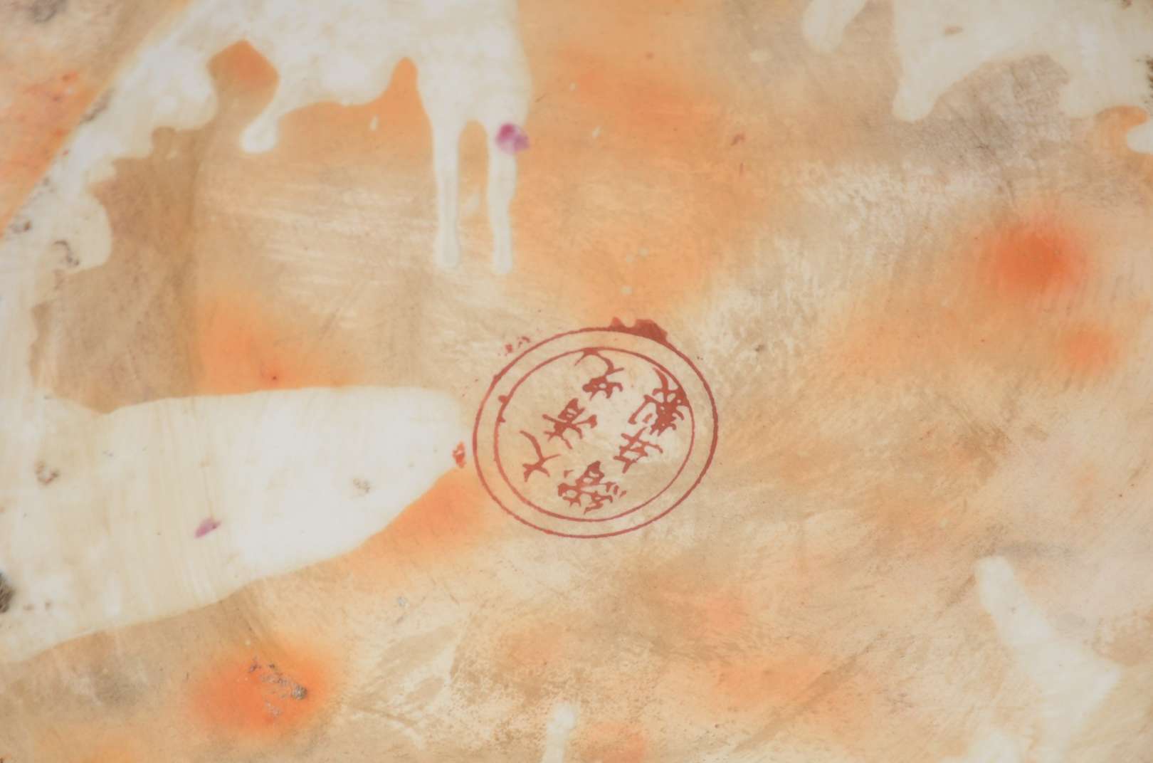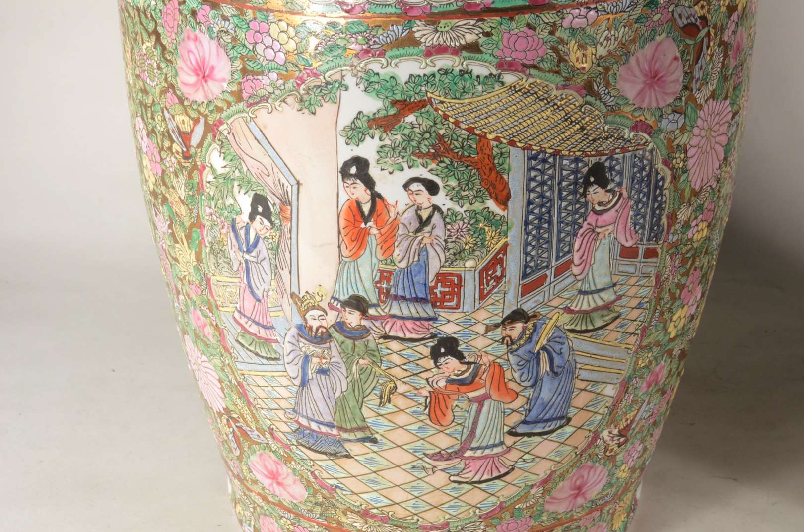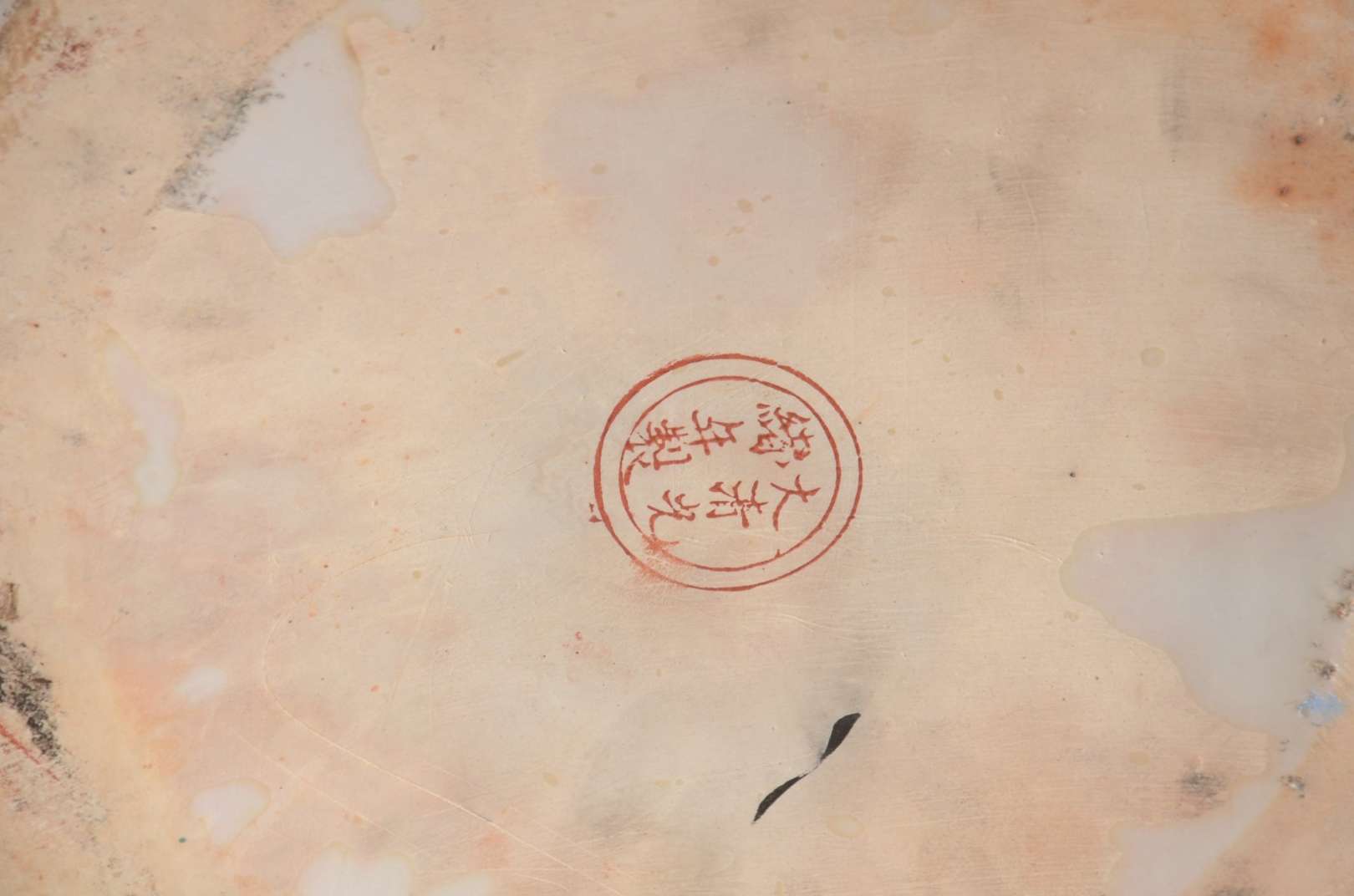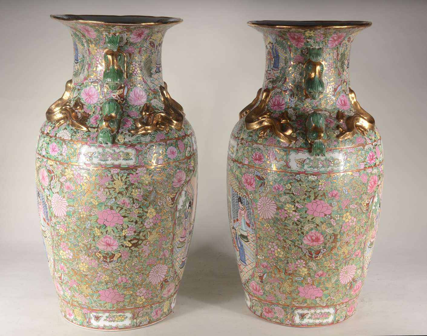 Vaso de porcelana oriental decorado com figuras em policromia, pegas laterais na forma de cabeças de animais. Marcado...
