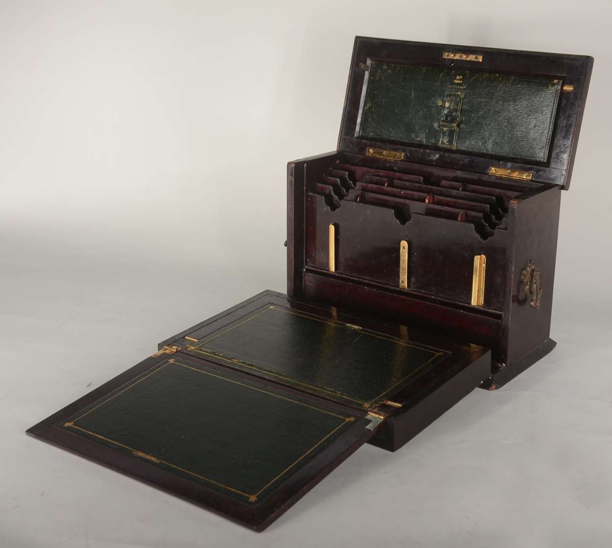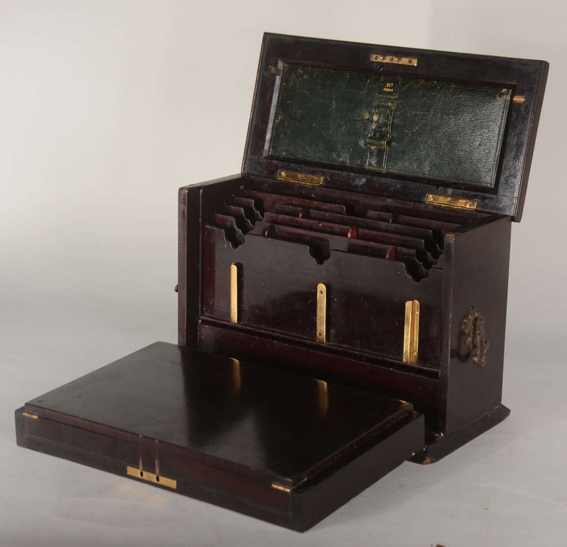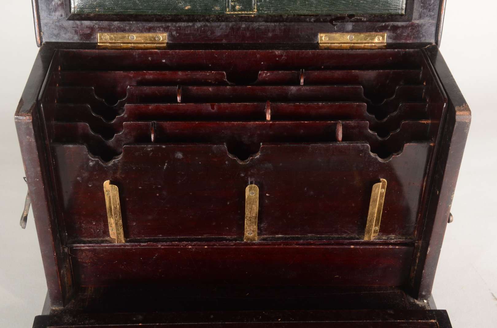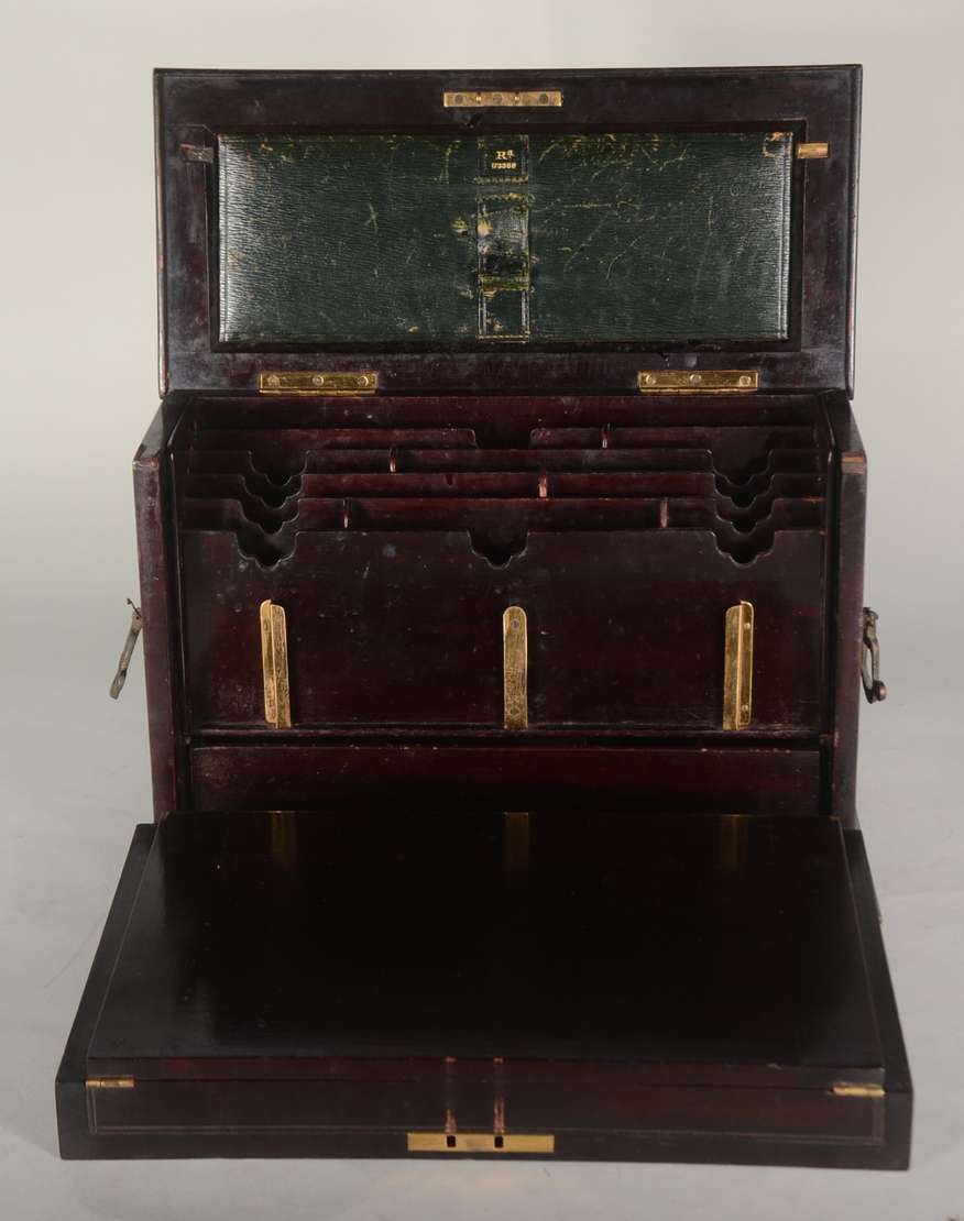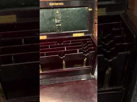 Escrivaninha de madeira nobre, tampo esteirinha com escaninhos internos, parte inferior com gavetas, e porta de estei...
