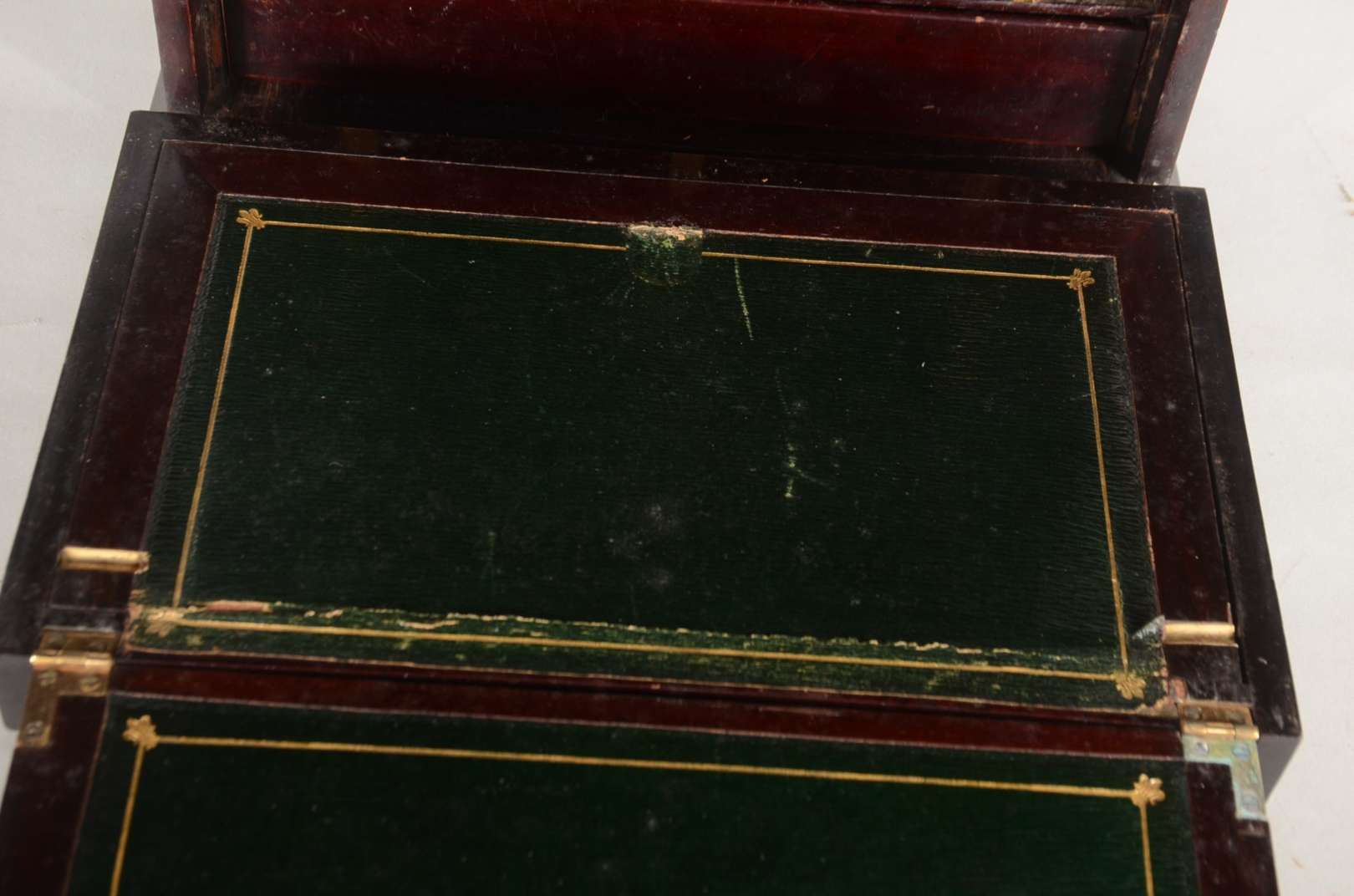 Mesa ninho de madeira nobre com 3 peças de encaixar, tampos de fórmica. Anos 60. Pequenos desgastes nos pés.