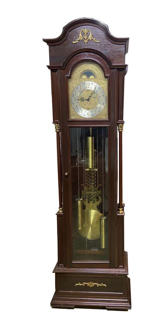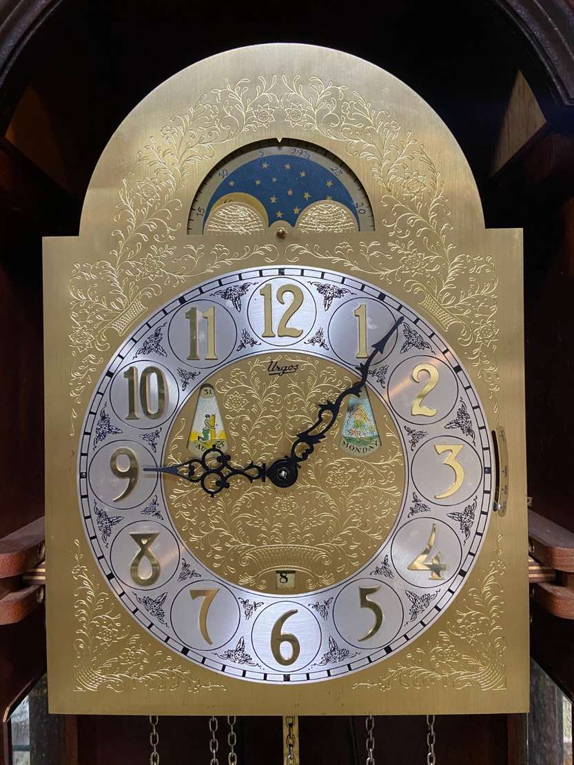 Relógio de mesa de bronze com placas de porcelana e figuras de camponeses. Funcionando.