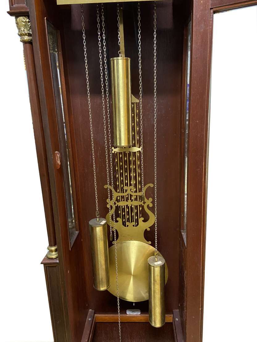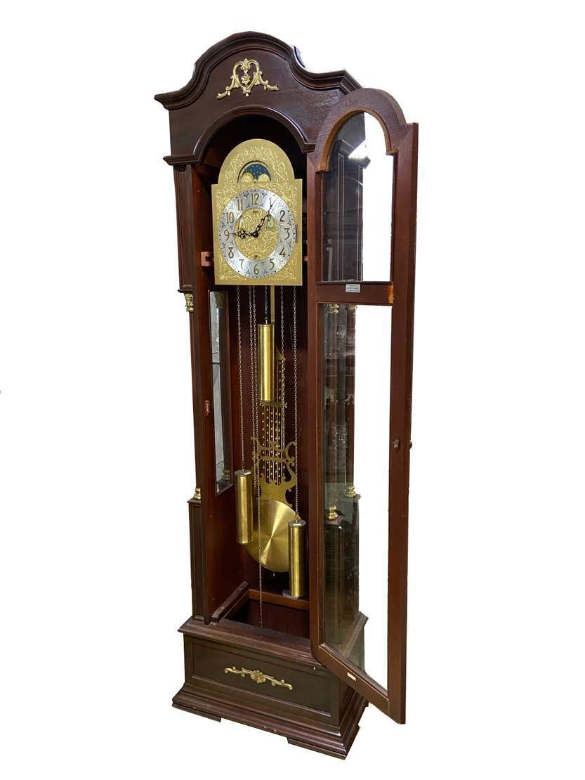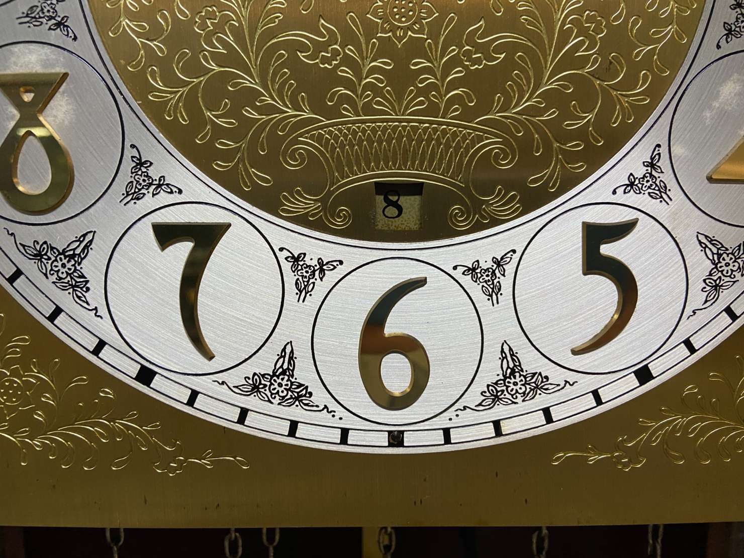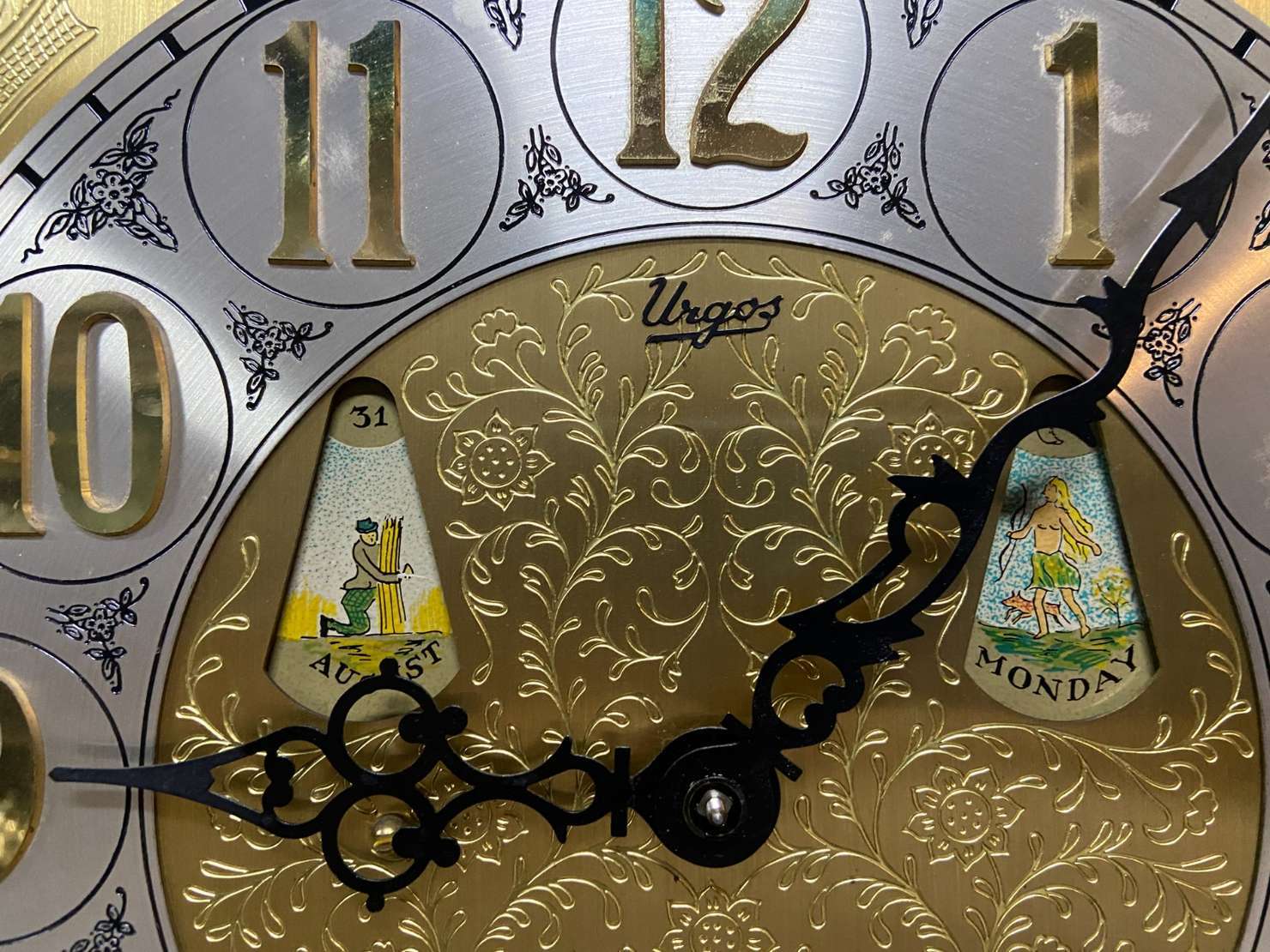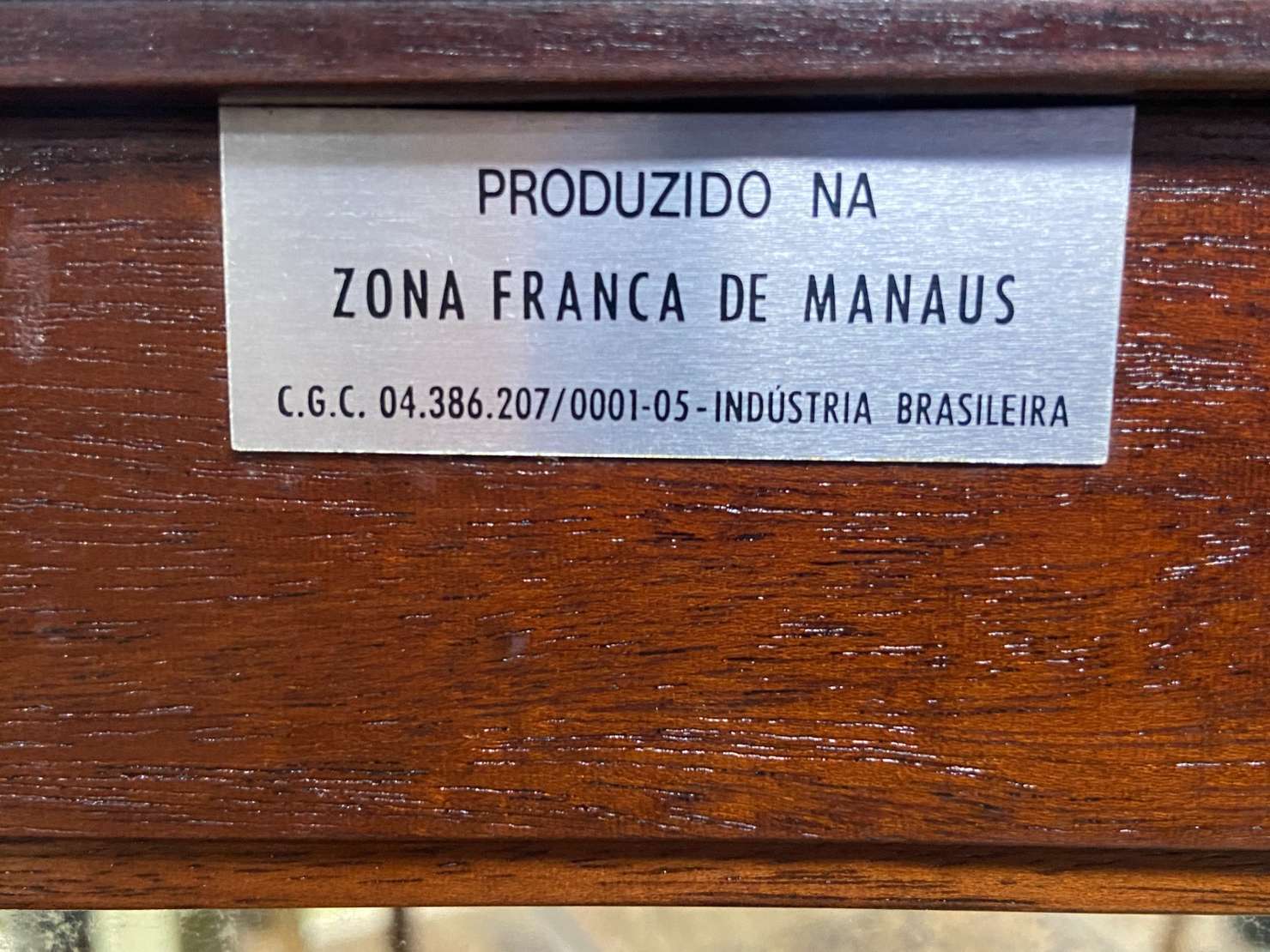 Relógio de mesa com caixa de madeira trabalhada em marqueterie. Funcionando. Desgastes e caixa com pequenos pontos de...