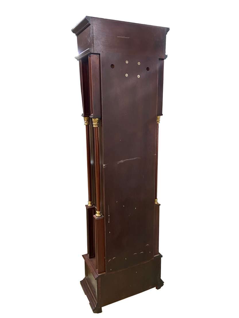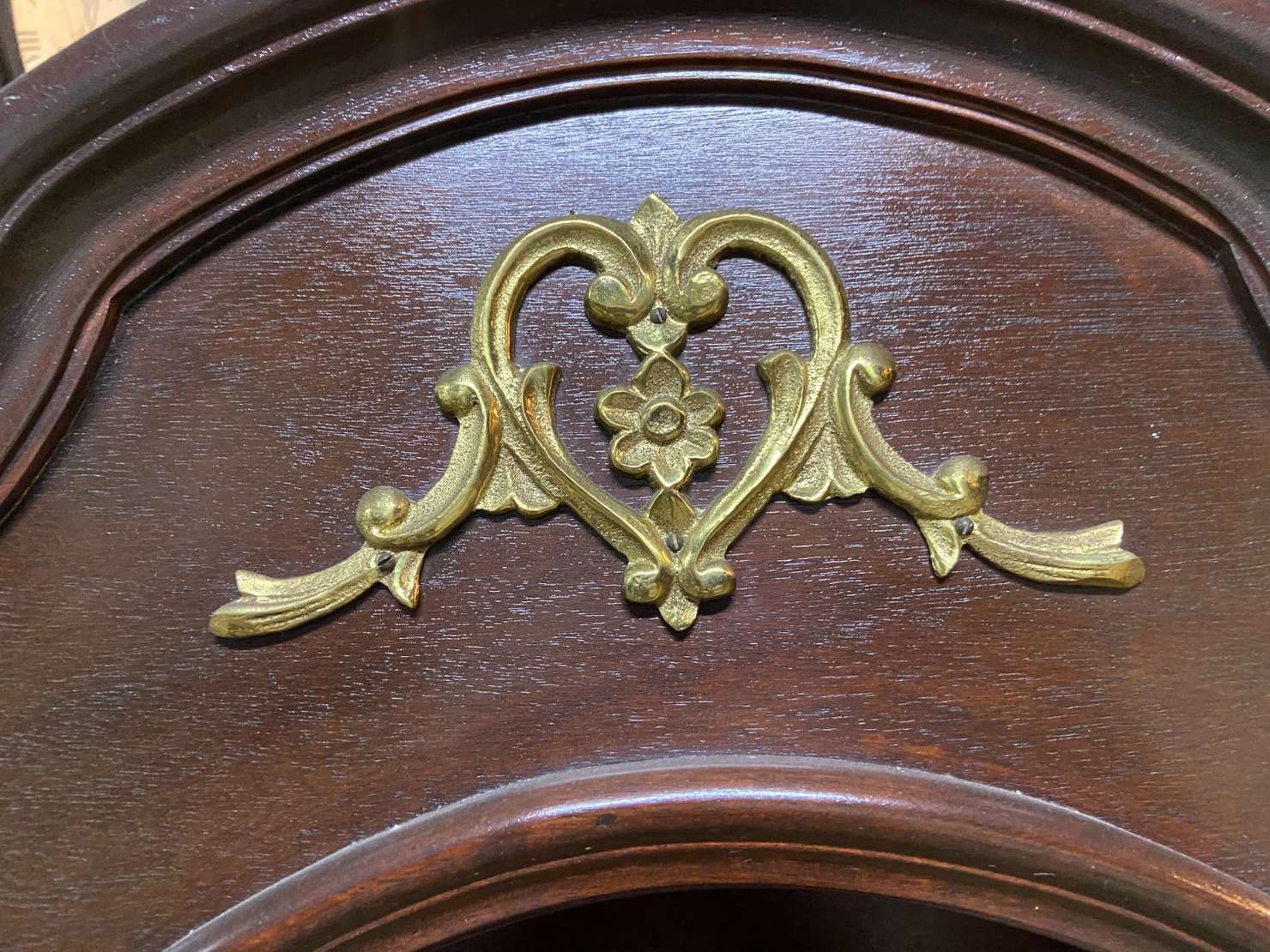 Relógio de mesa de bronze decorado com guirlandas florais, mostrador com algarismos romanos. Máquina parada.