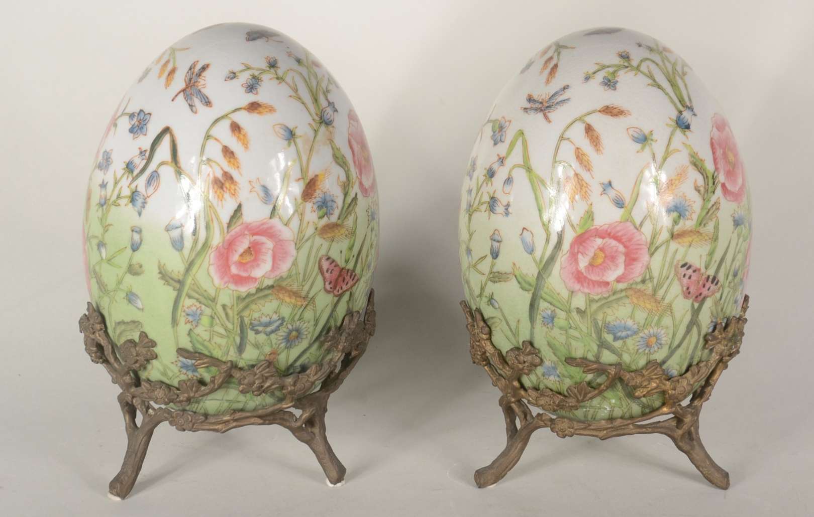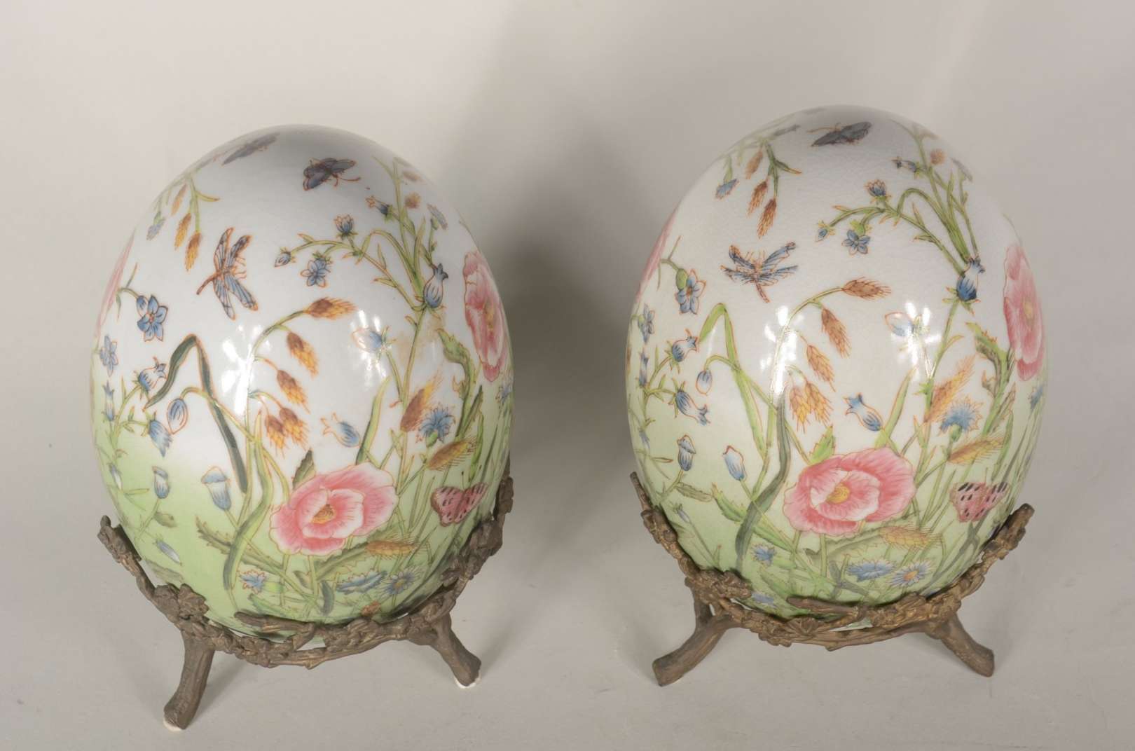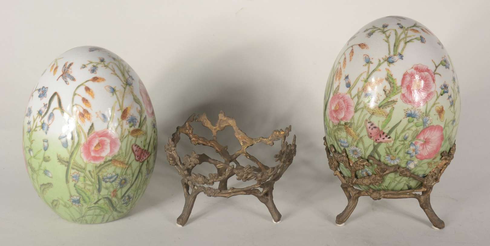 Par de ovos/Pinha de porcelana com borboletas e flores em policromia, bases de metal.
