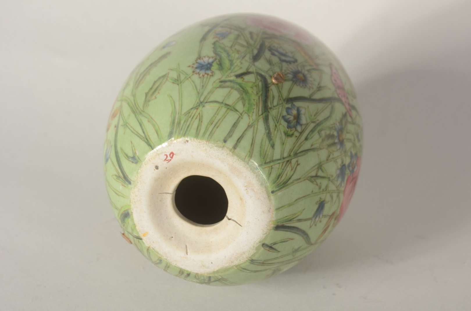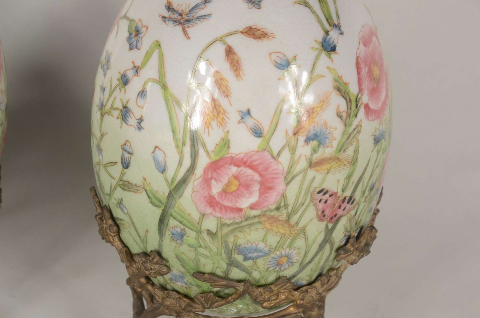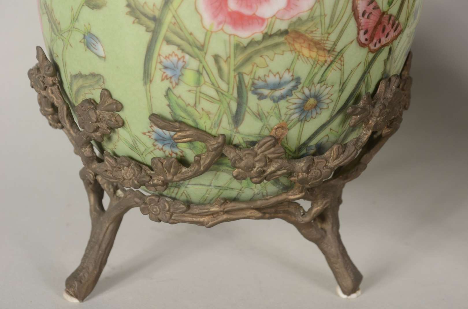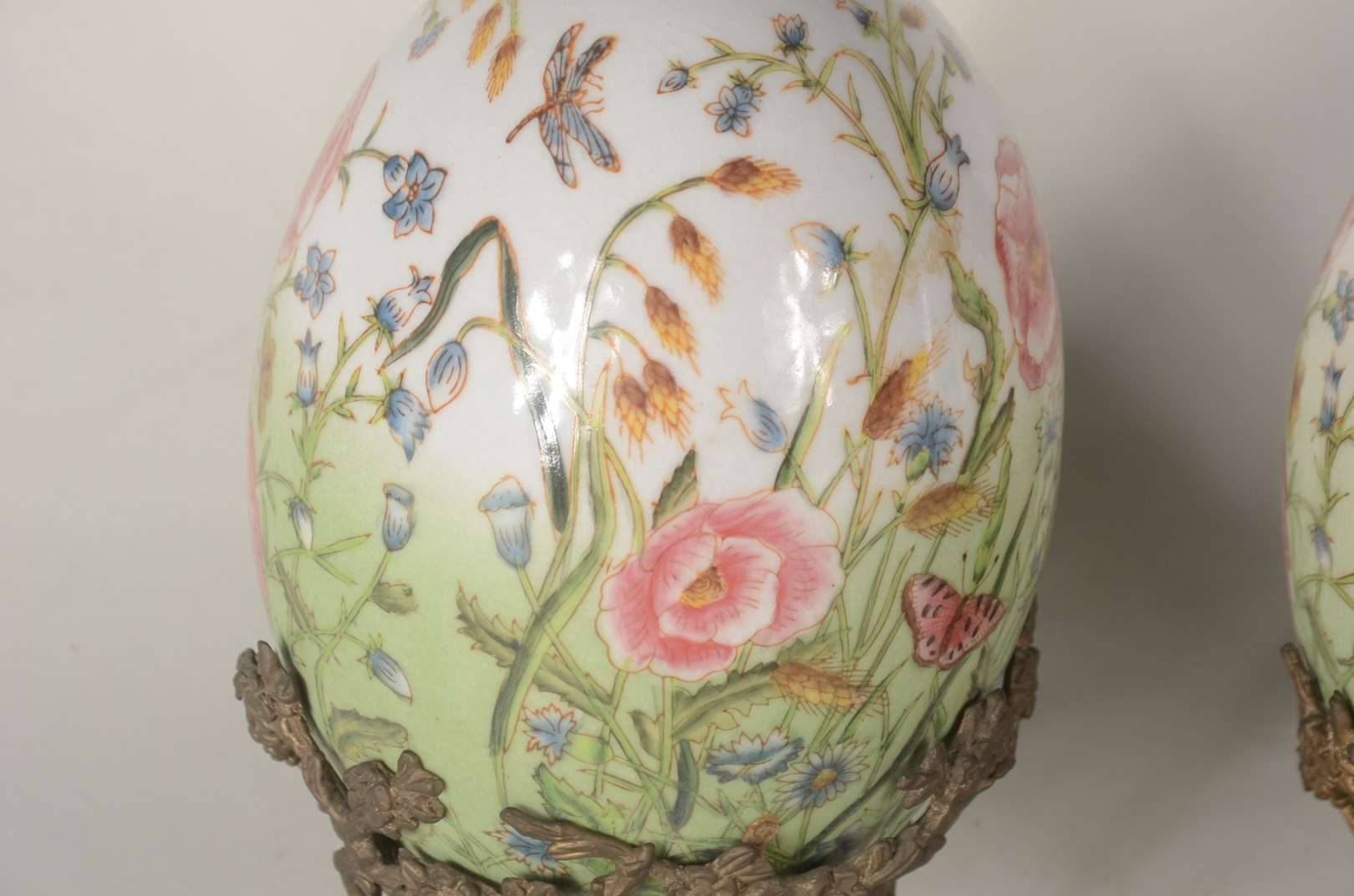 Par de ovos/Pinha de porcelana com borboletas e flores em policromia, bases de metal.