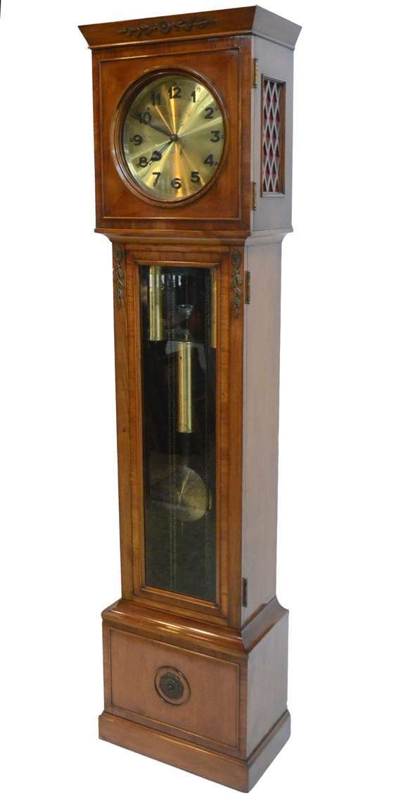Elegante Relógio carrilhão de coluna alemão, caixa de madeira da Laubisch Hirth, porta de cristal bisotado. Funcionando.