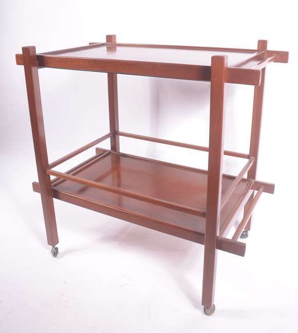 Carrinho de chá de madeira nobre, dois platôs unidos por colunas retas, sobre rodízios.