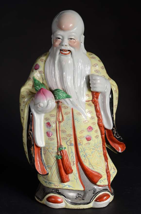 Escultura de porcelana oriental policromada representando Buda.