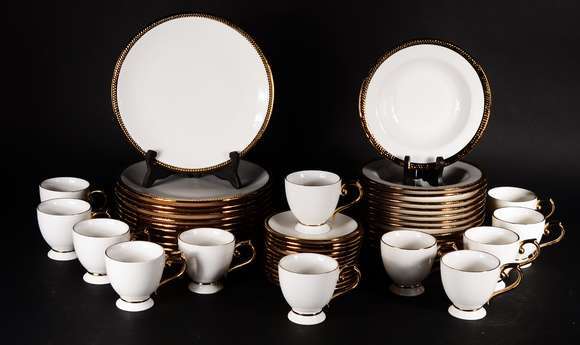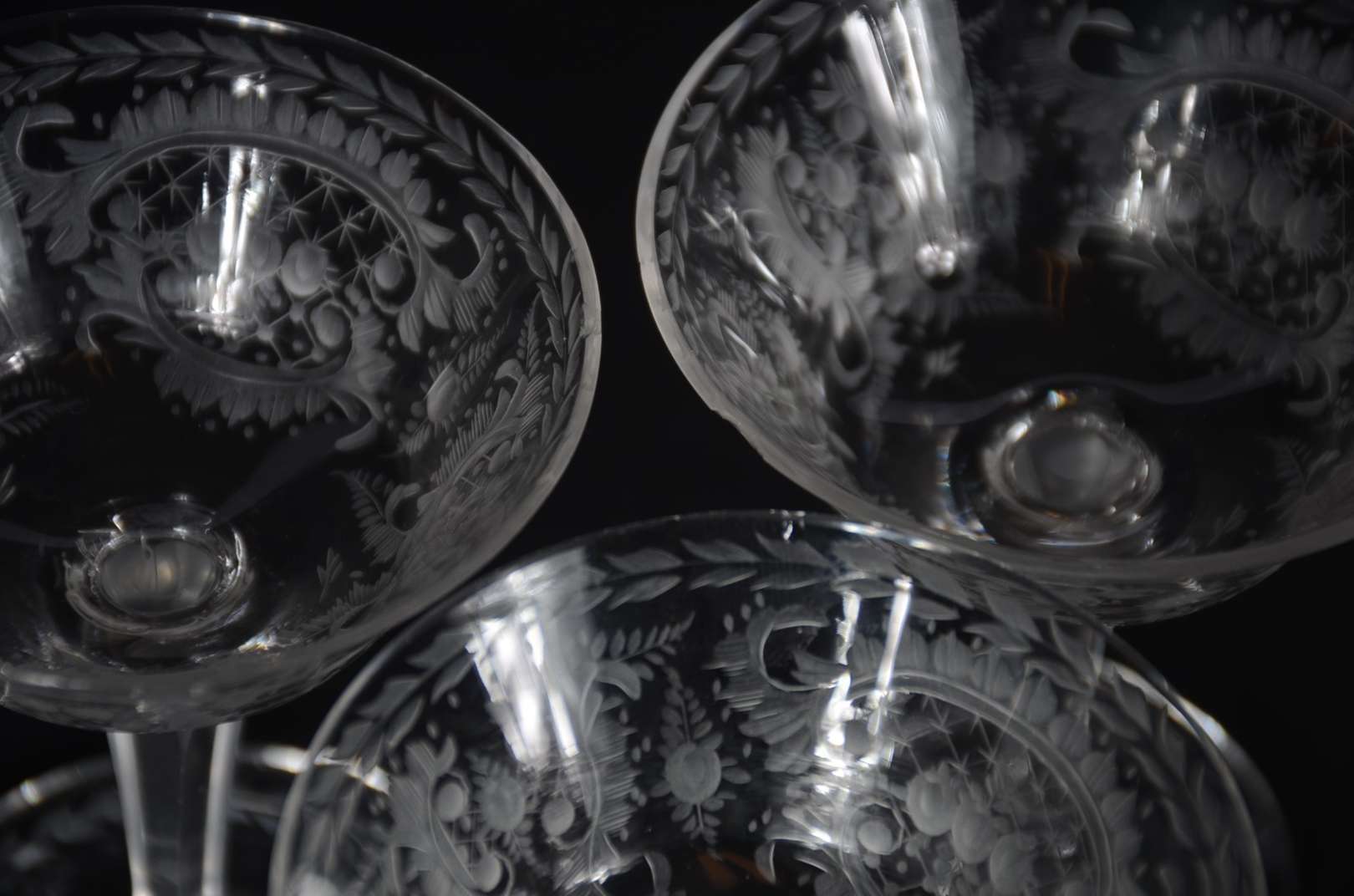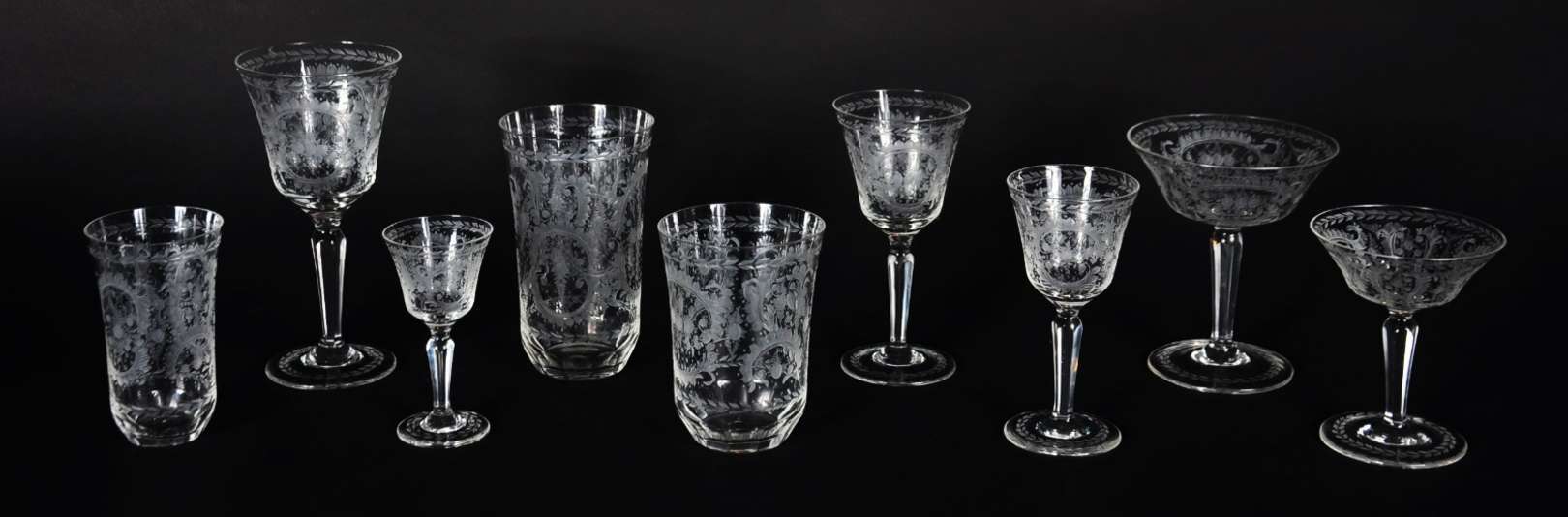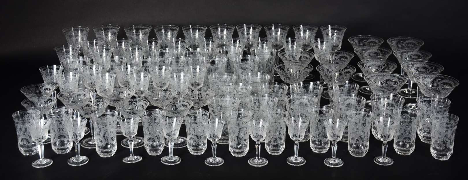 Serviço de cristal europeu lavrado com guirlandas, composto de: 10 taças para vinho tinto, 12 para vinho branco, 12 para champagne, 10 longos, 12 para água, 11 para batida, 9 para drink, 9 para vinho do Porto e 9 para licor. Total: 94 peças.
