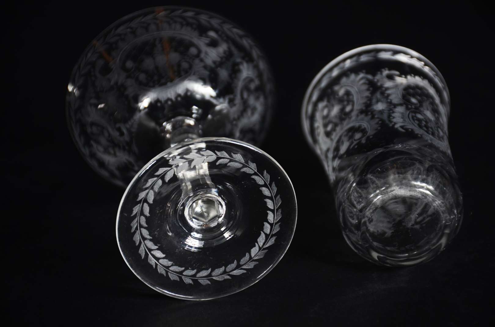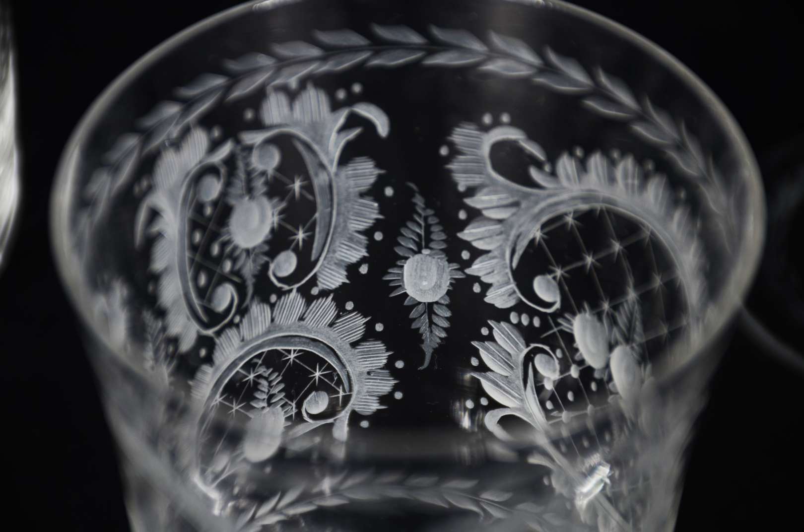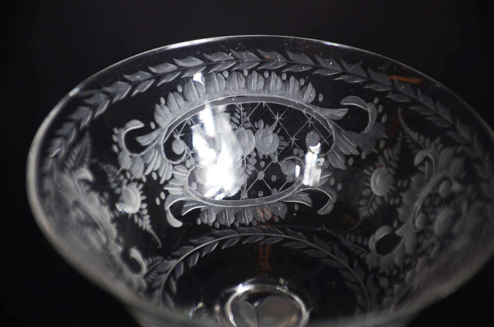 Serviço de cristal europeu lavrado com guirlandas, composto de: 10 taças para vinho tinto, 12 para vinho branco, 12 para champagne, 10 longos, 12 para água, 11 para batida, 9 para drink, 9 para vinho do Porto e 9 para licor. Total: 94 peças.