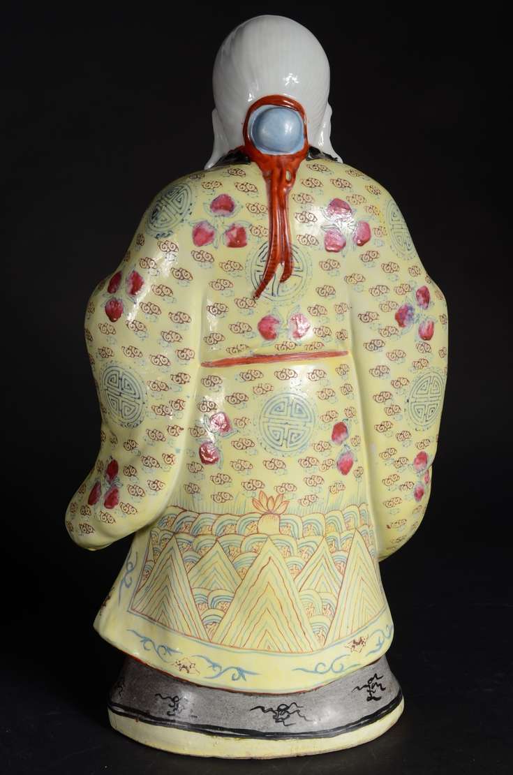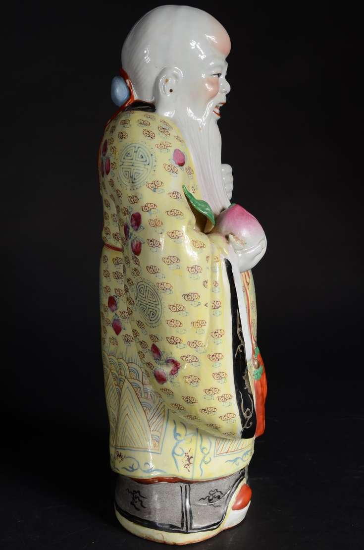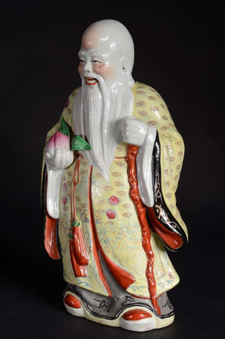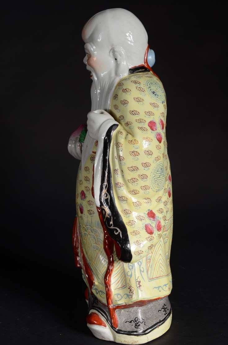 Estatueta oriental de madeira entalhada representando ancião. Pequenos defeitos.