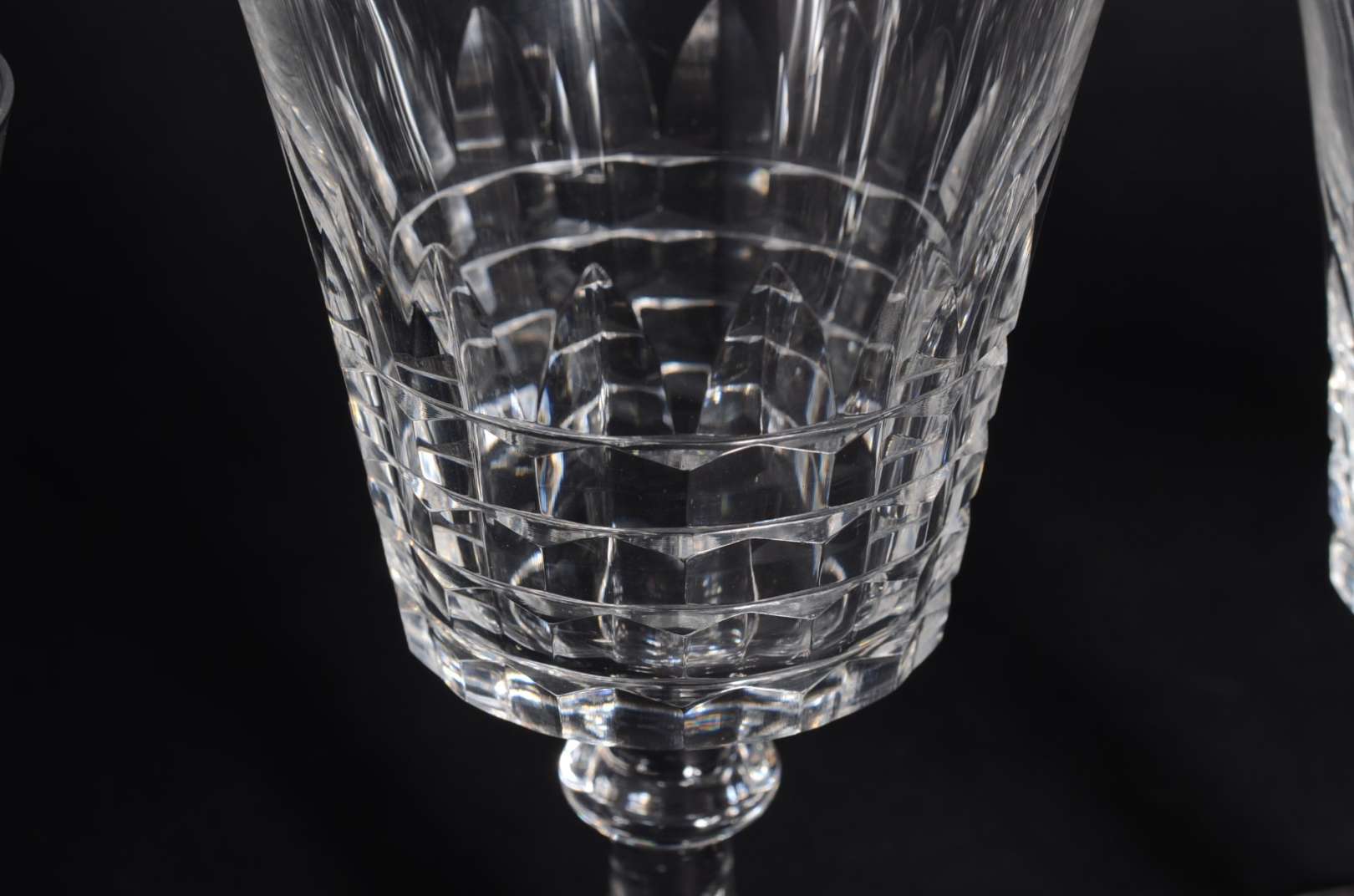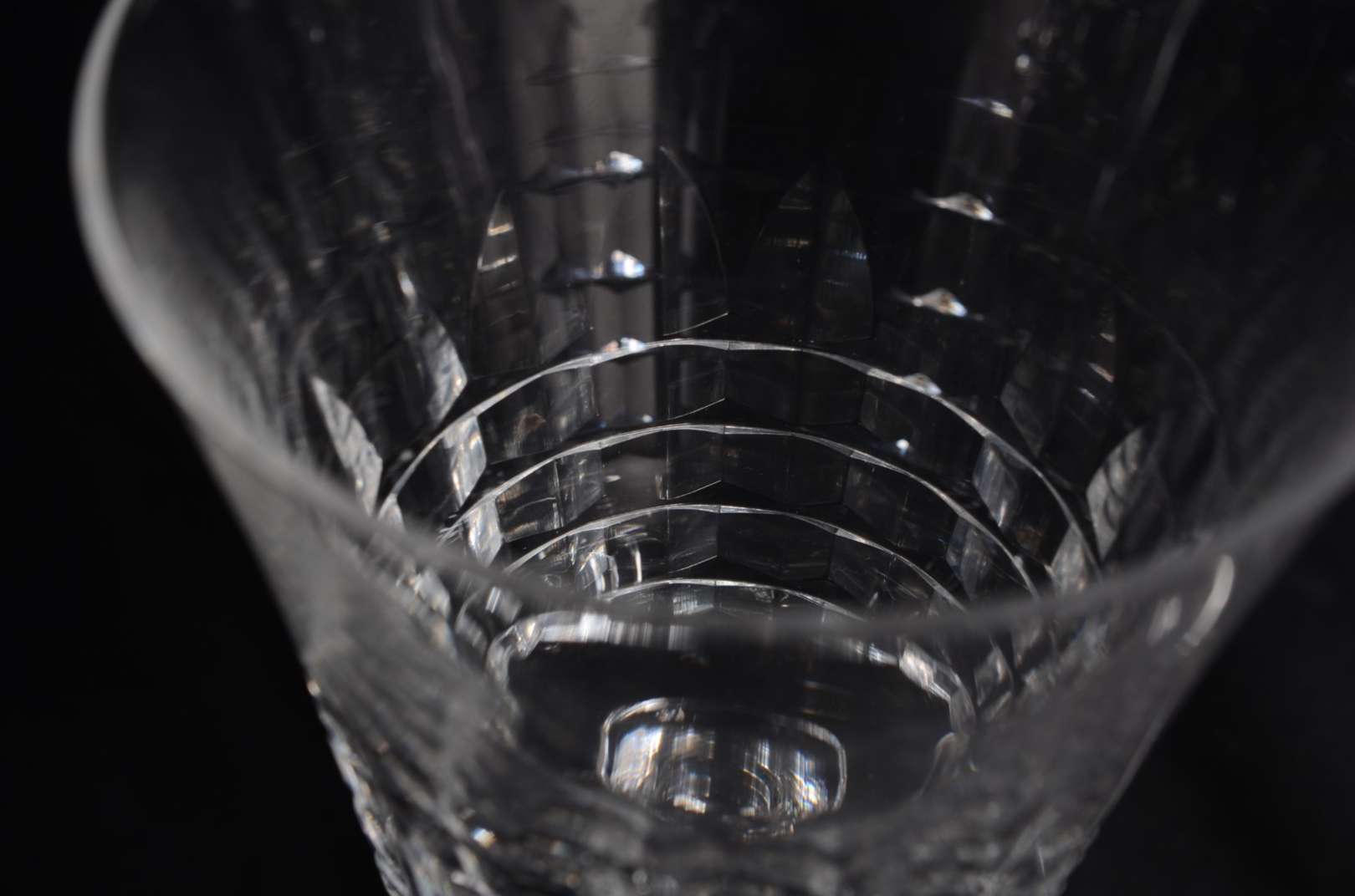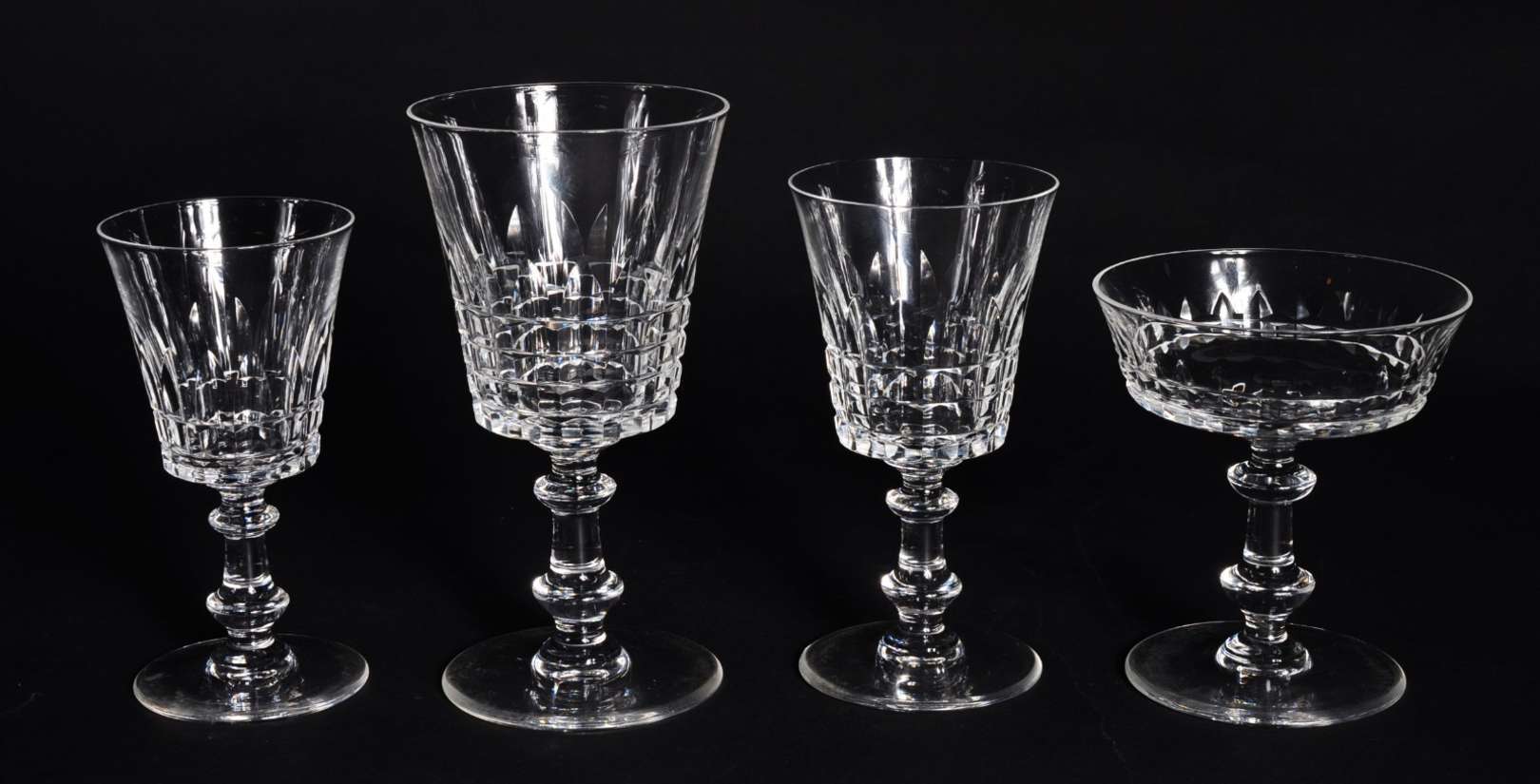 Parte de serviço de cristal europeu lavrado, sendo: 3 taças para vinho tinto, 7 para vinho branco e 6 para água (lige...