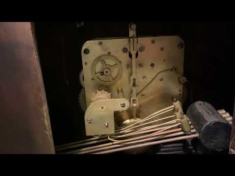 Relógio de parede feitio capelinha, caixa de madeira entalhada. Funcionando. Com chave.