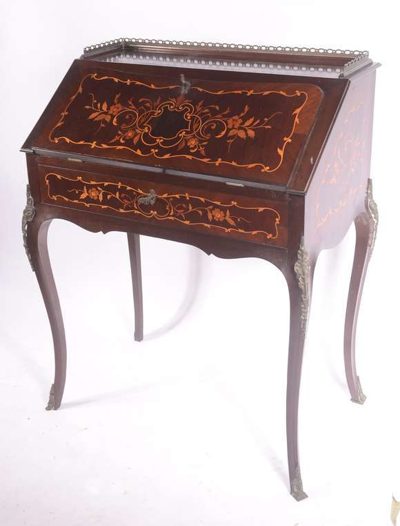 ""Bonheur du jour" - Escrivaninha estilo frances de madeira ricamente trabalhada em marqueterie guirlandas florais, u...