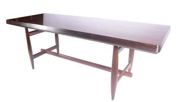 Mesa de jantar de jacarandá, tampo retangular sobre pernas abauladas unidas por trave central, anos 60. Feito sob enc...