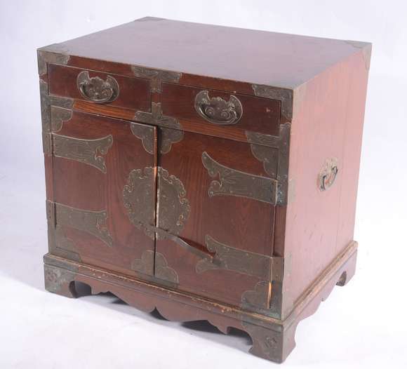 Pequeno móvel de madeira estilo oriental com aplicações de metal. Pequenos desgastes.