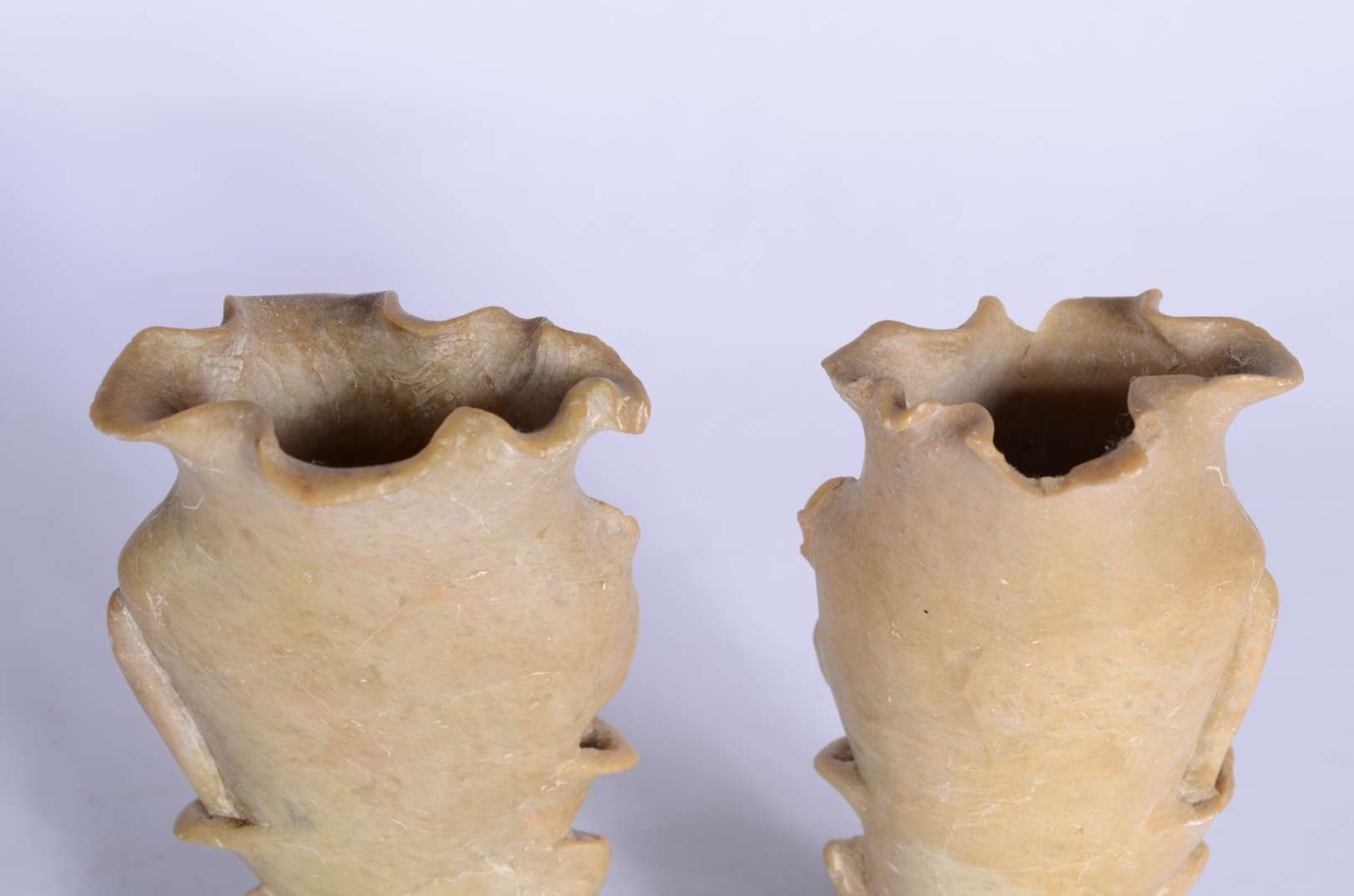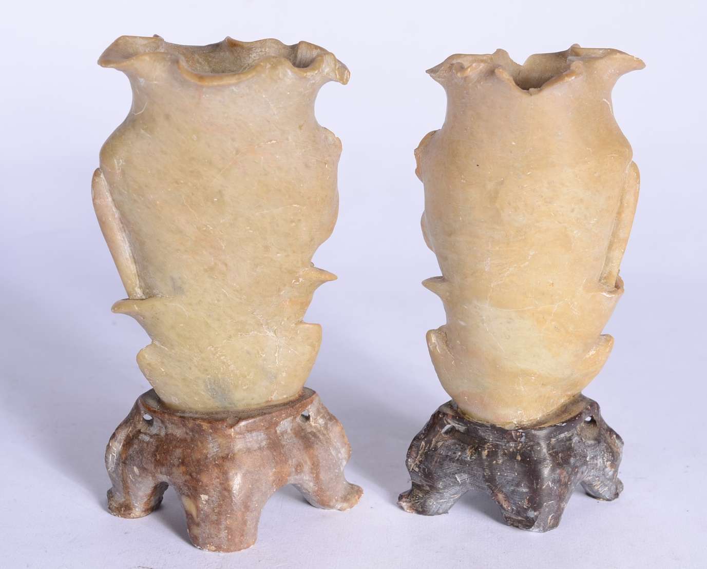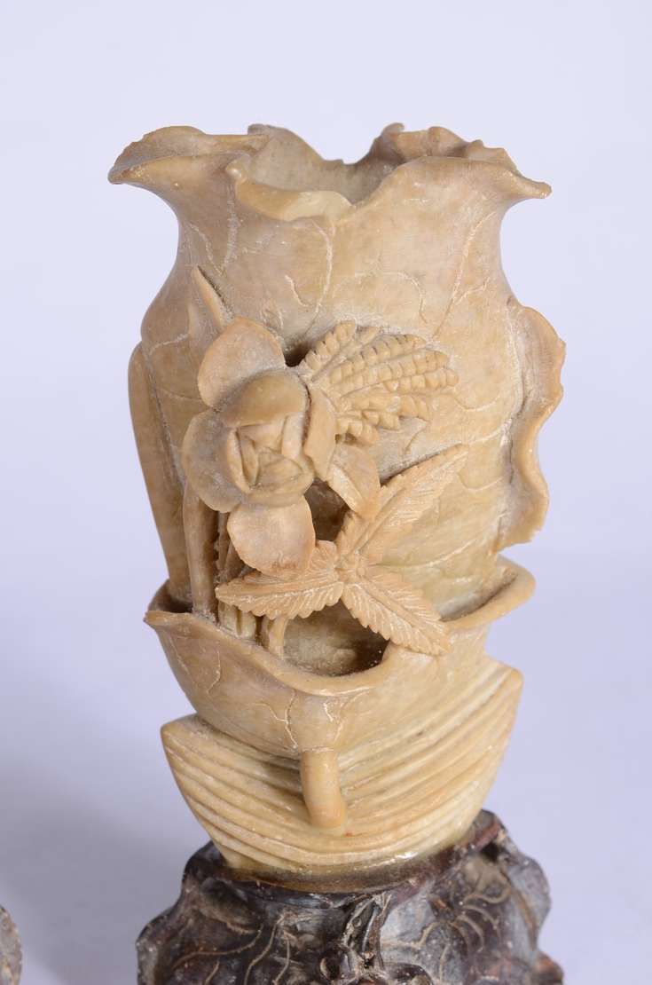 Duas esculturas de marfim representando gueixas. Altura total: 12 cm e 24 cm.