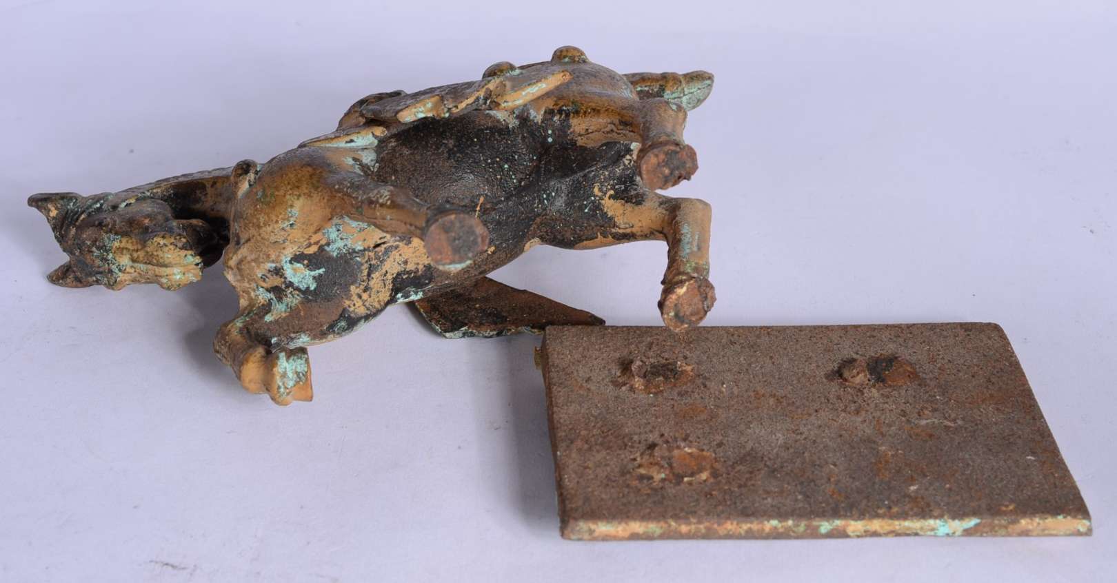 Escultura de bronze representando figura feminina.