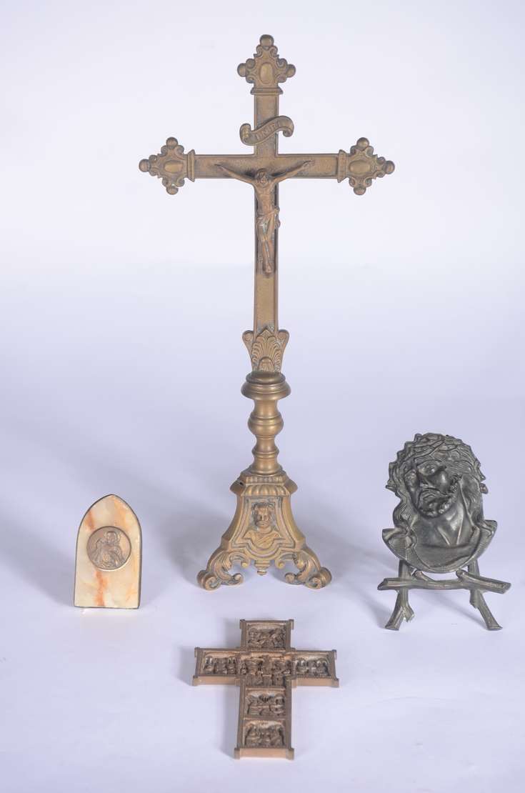 Cinco peças diversas, sendo: 4 tankards, sendo um de estanho e 3 de cerâmica; e, luminária de metal dourado para 2 lu...