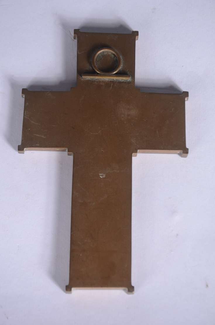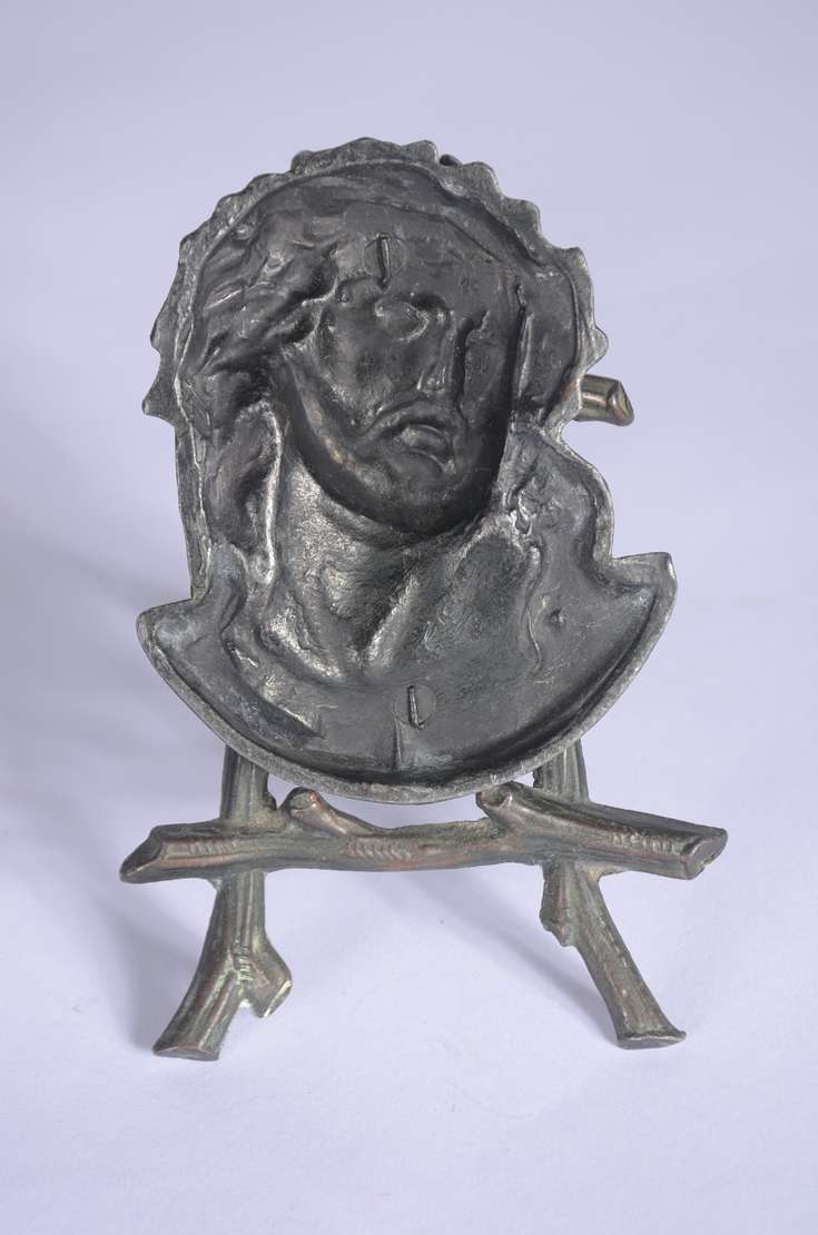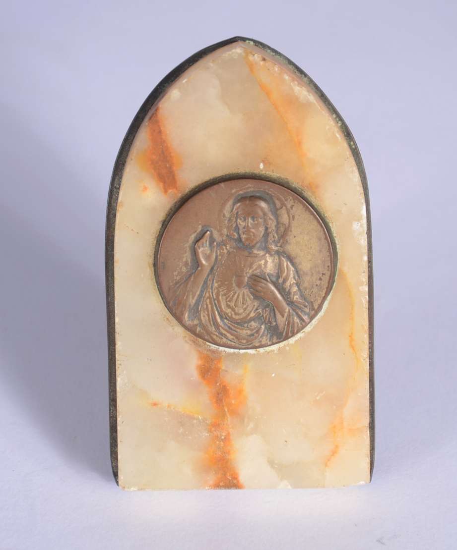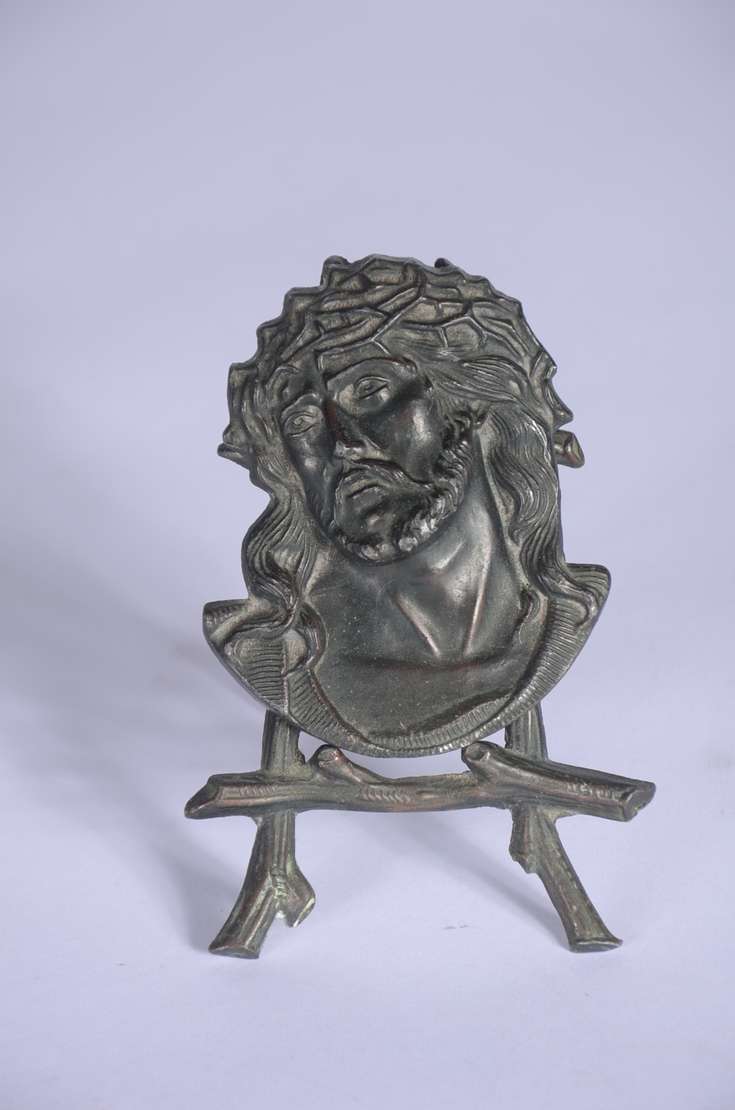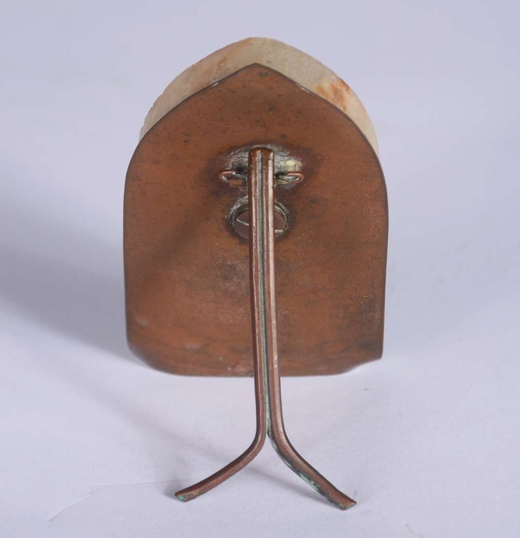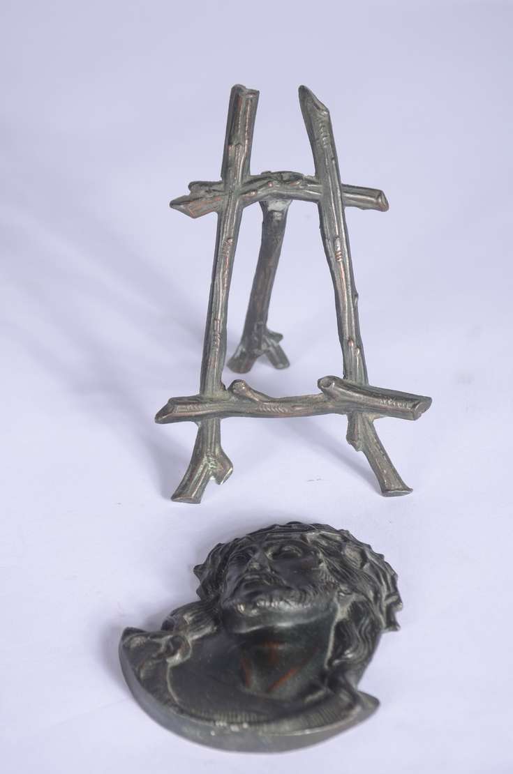 Medalhão de bronze representando figura feminina de perfil com capacete. Assinado.