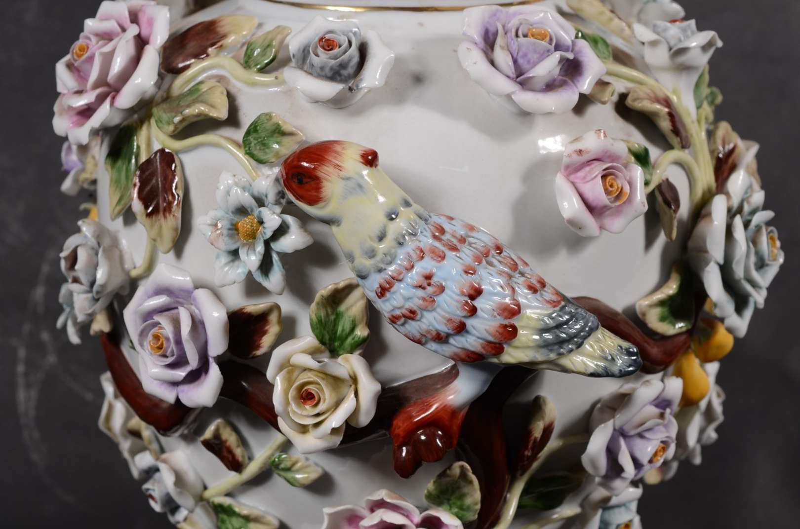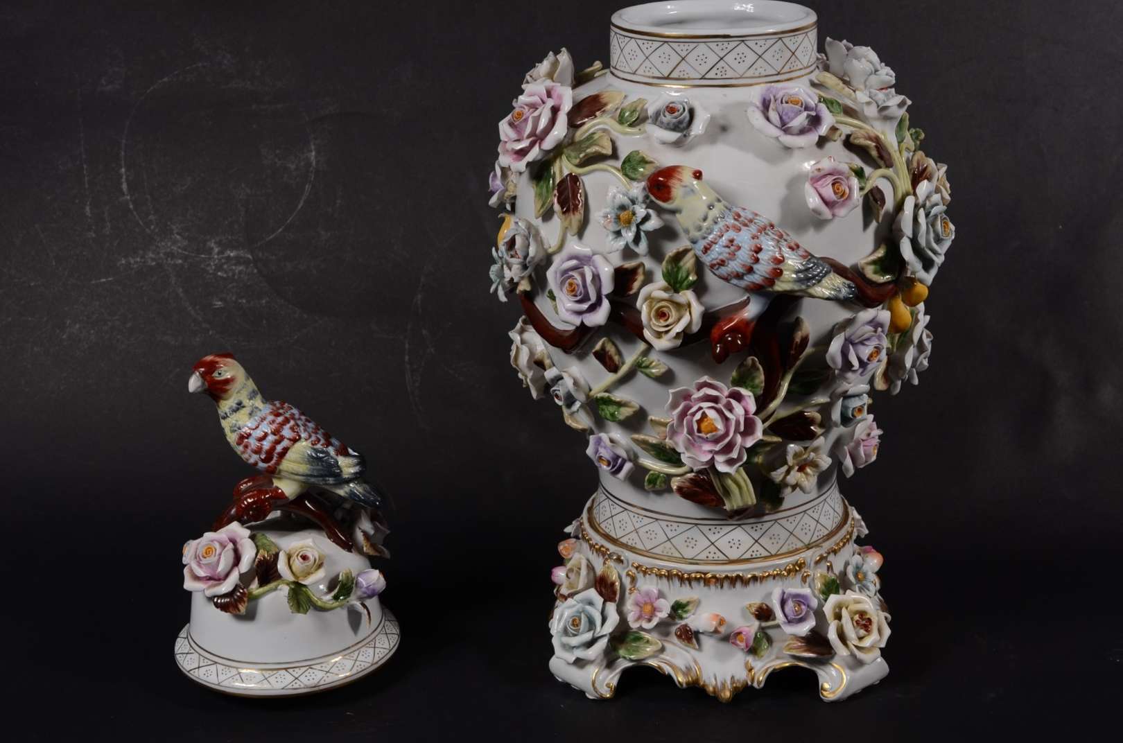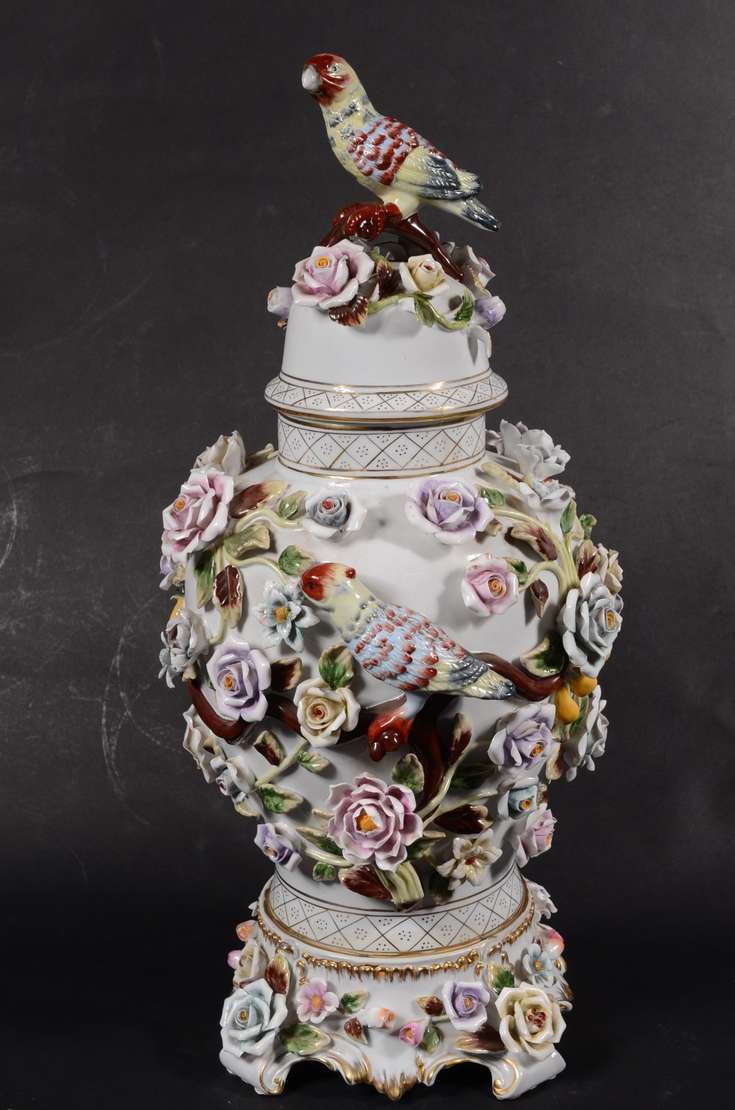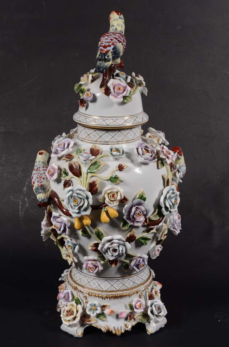 Dois potiches de faiança policromada, detalhes em madeira. Com craquelê.