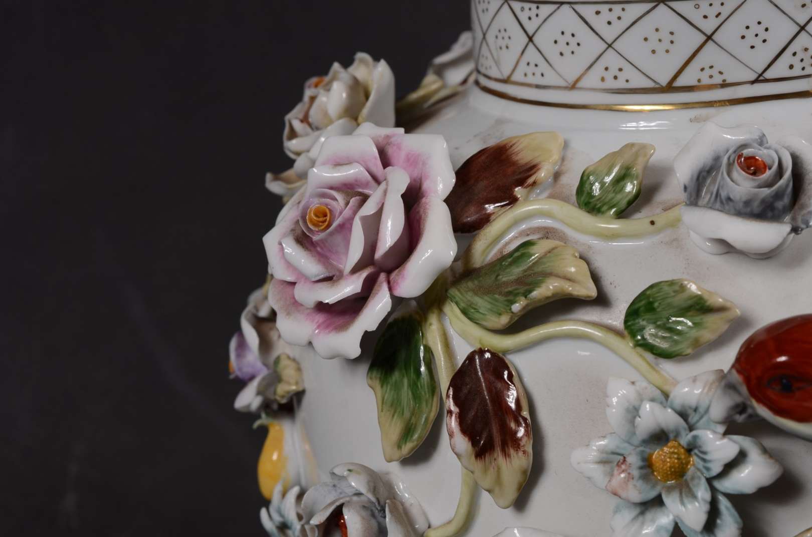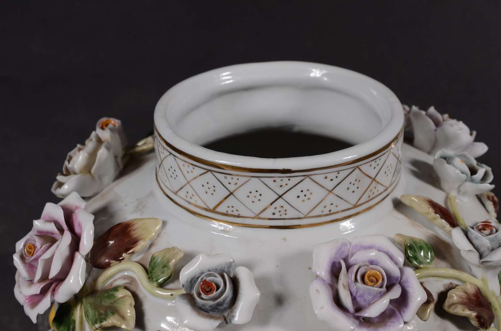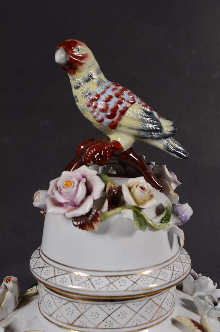 Ânfora de porcelana francesa decorada com figura de dama em policromia e guirlandas douradas sobre fundo branco, e do...