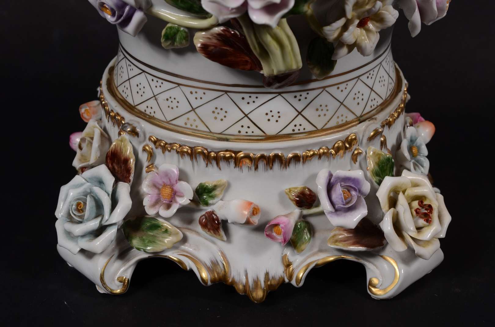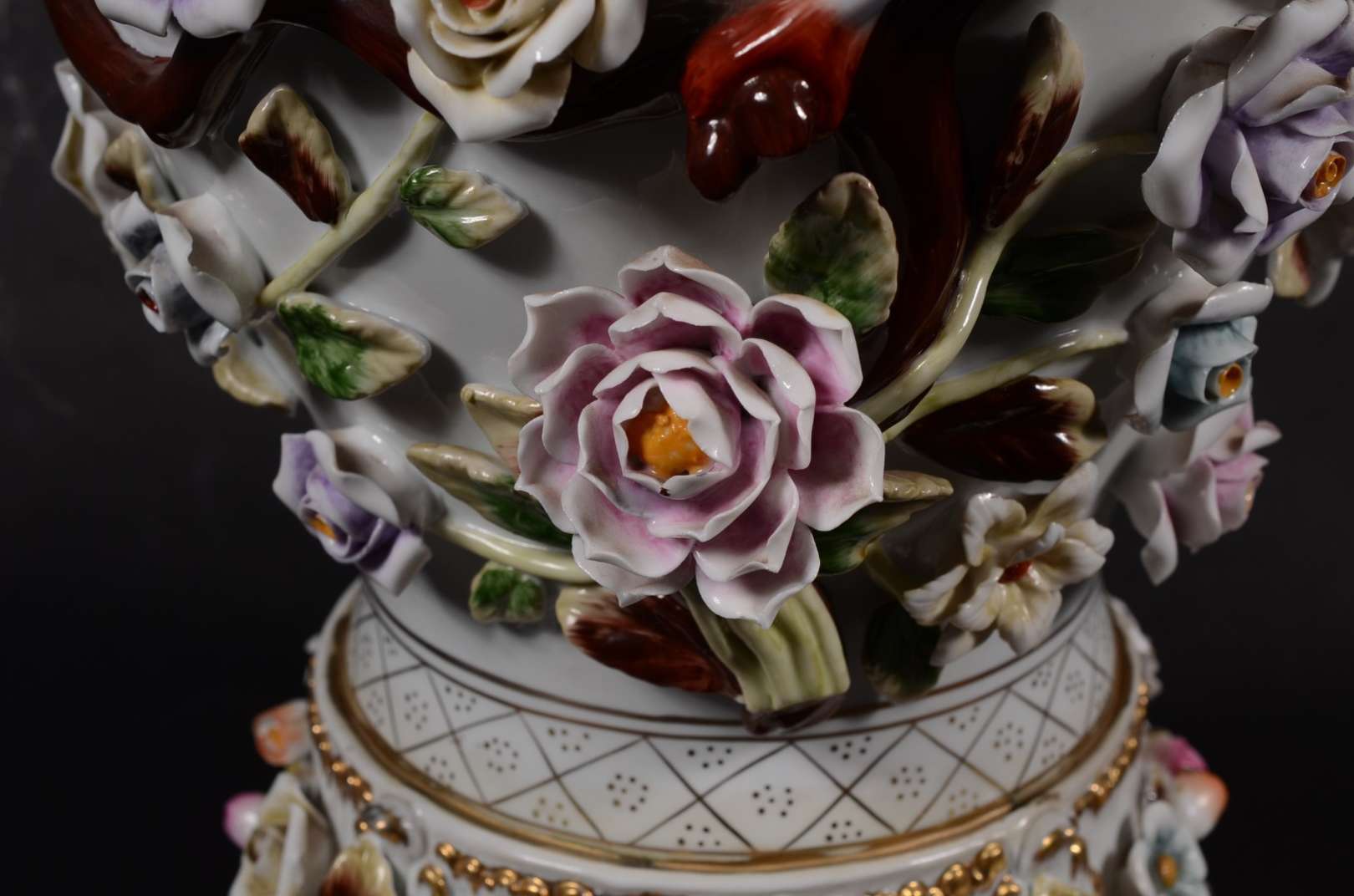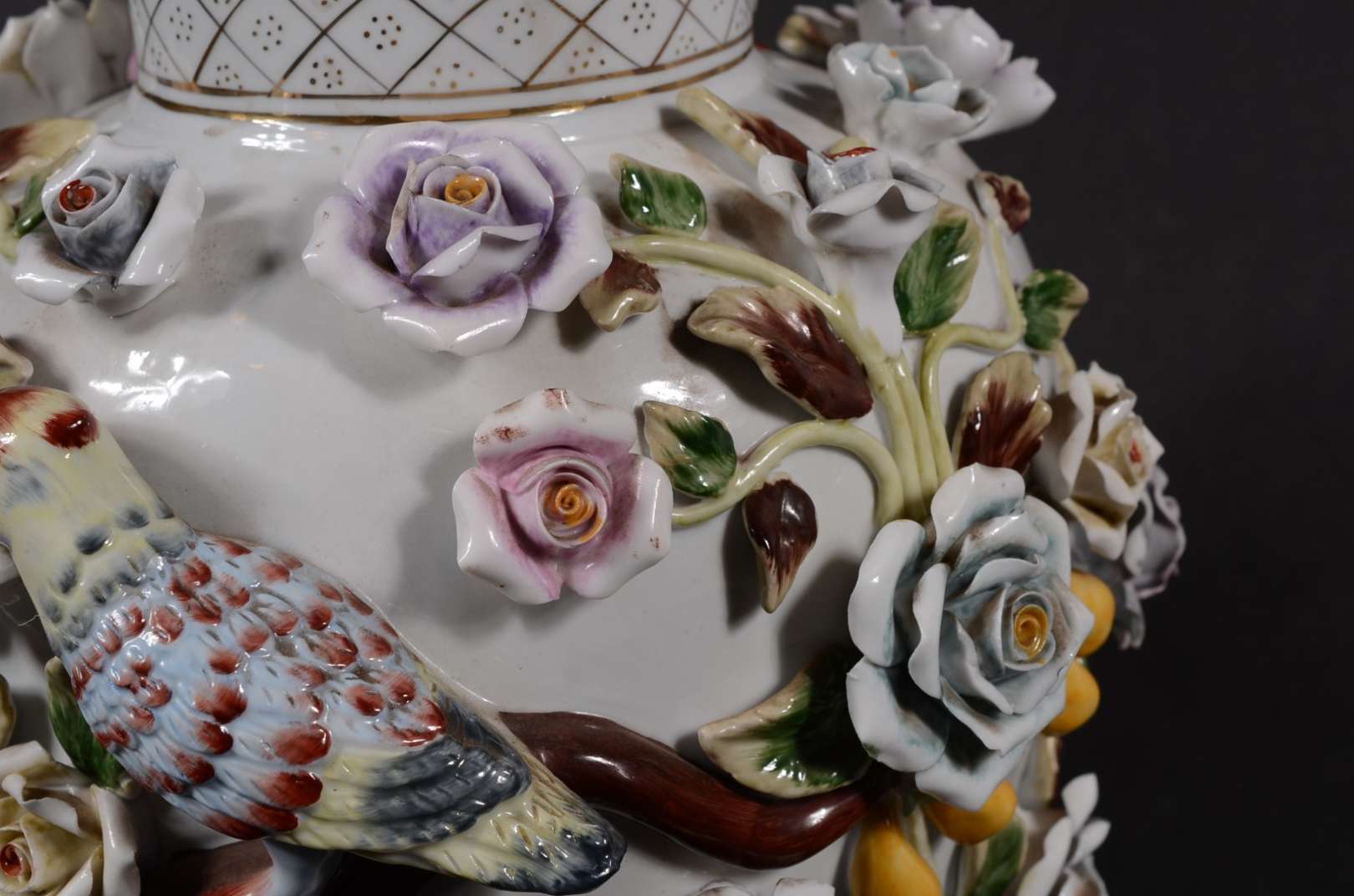 Ânfora de porcelana francesa decorada com figura de dama em policromia e guirlandas douradas sobre fundo branco, e do...