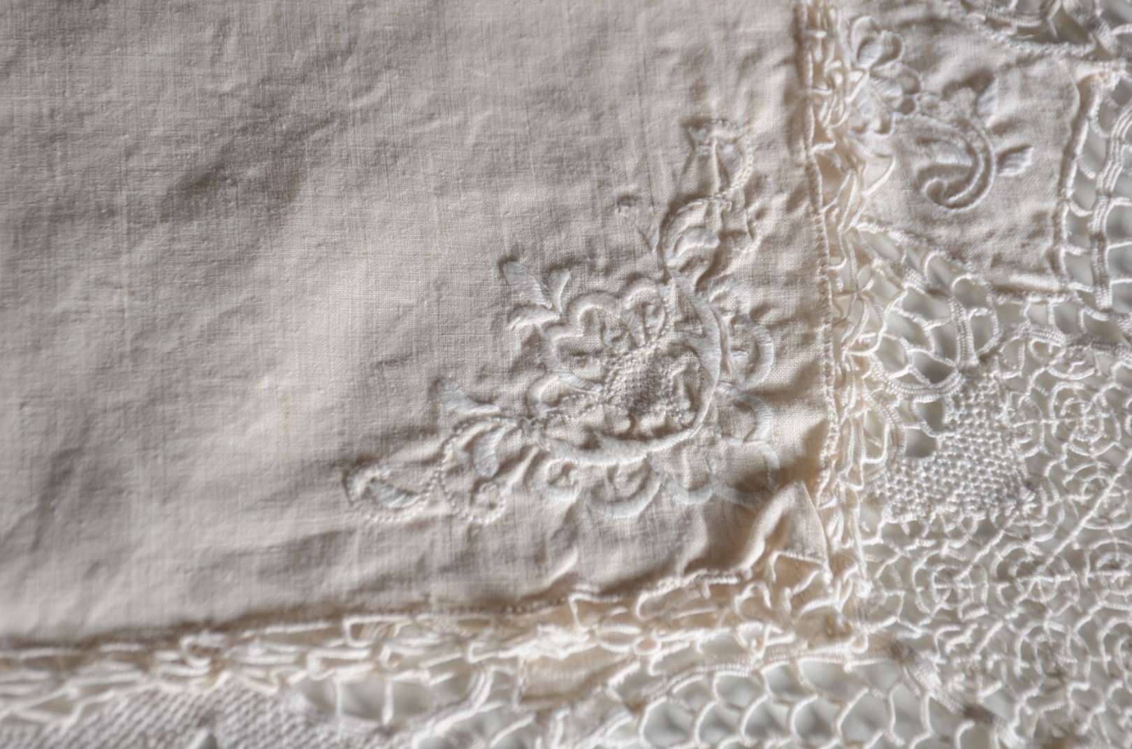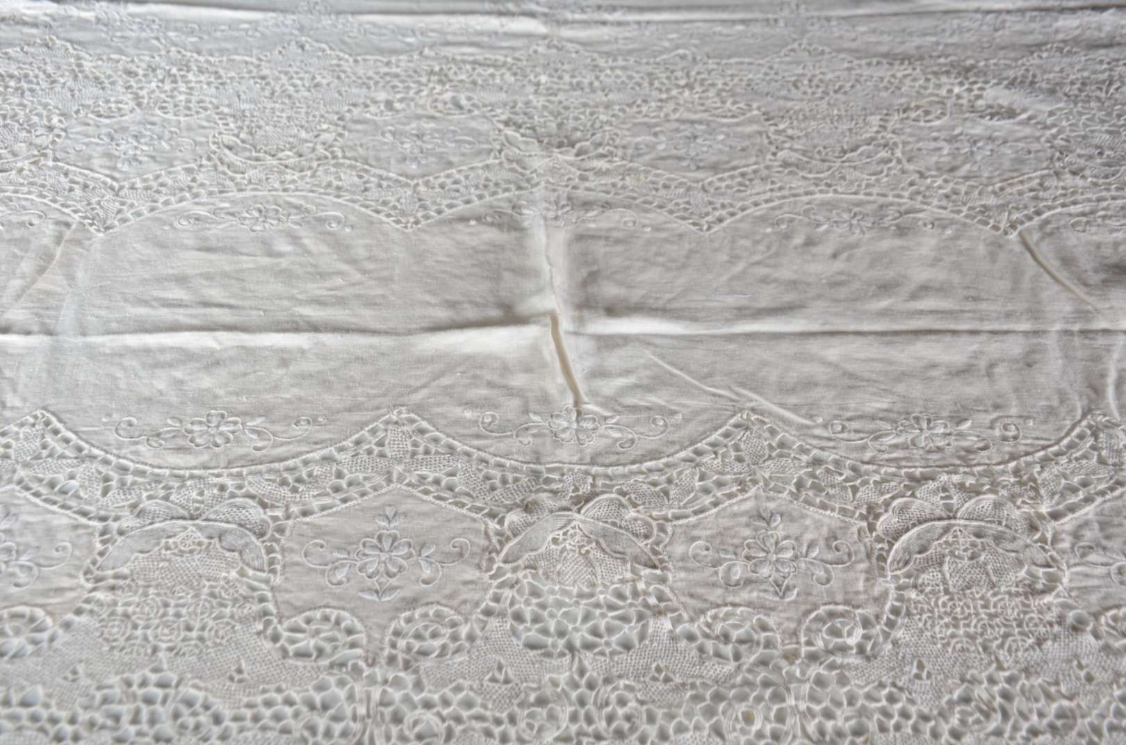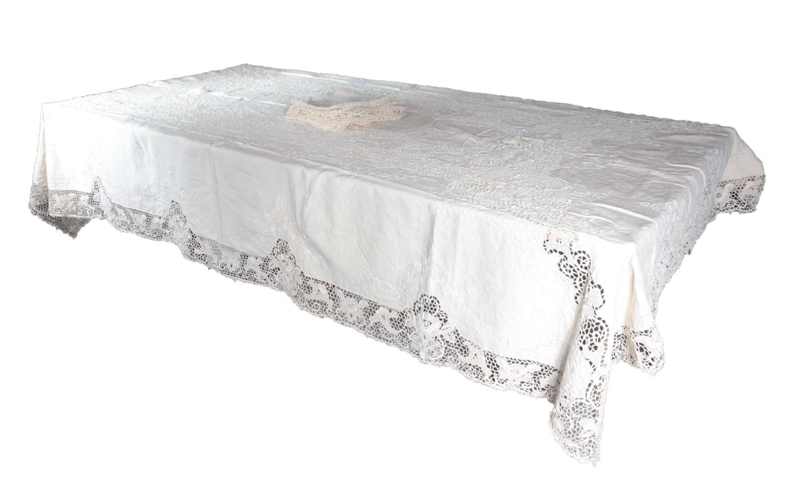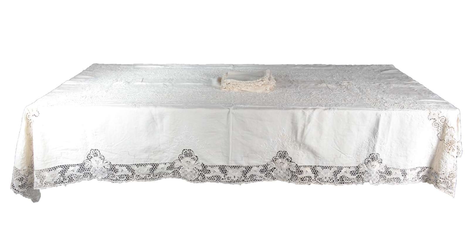 Toalha de mesa de linho com bordados. Acompanham 12 guardanapos.