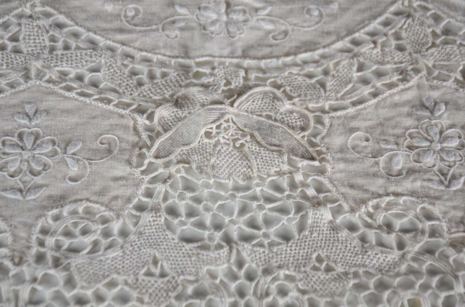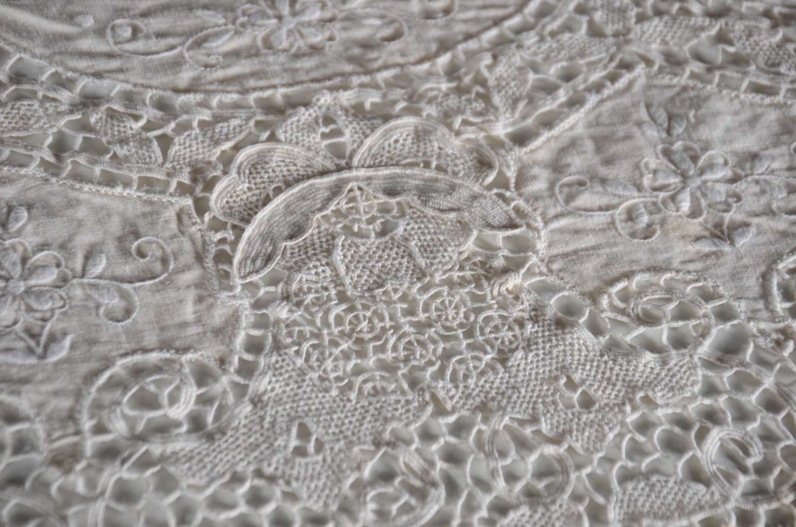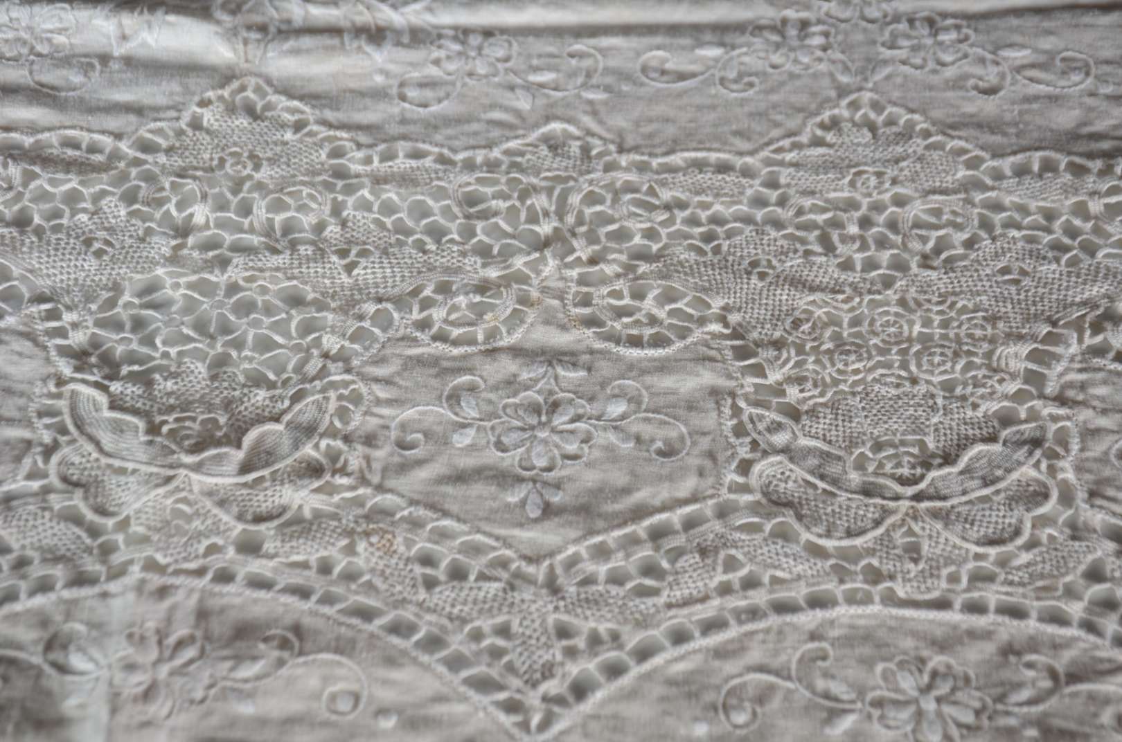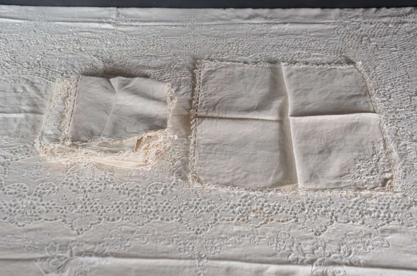 Toalha de mesa de linho com bordados. Acompanham 12 guardanapos.