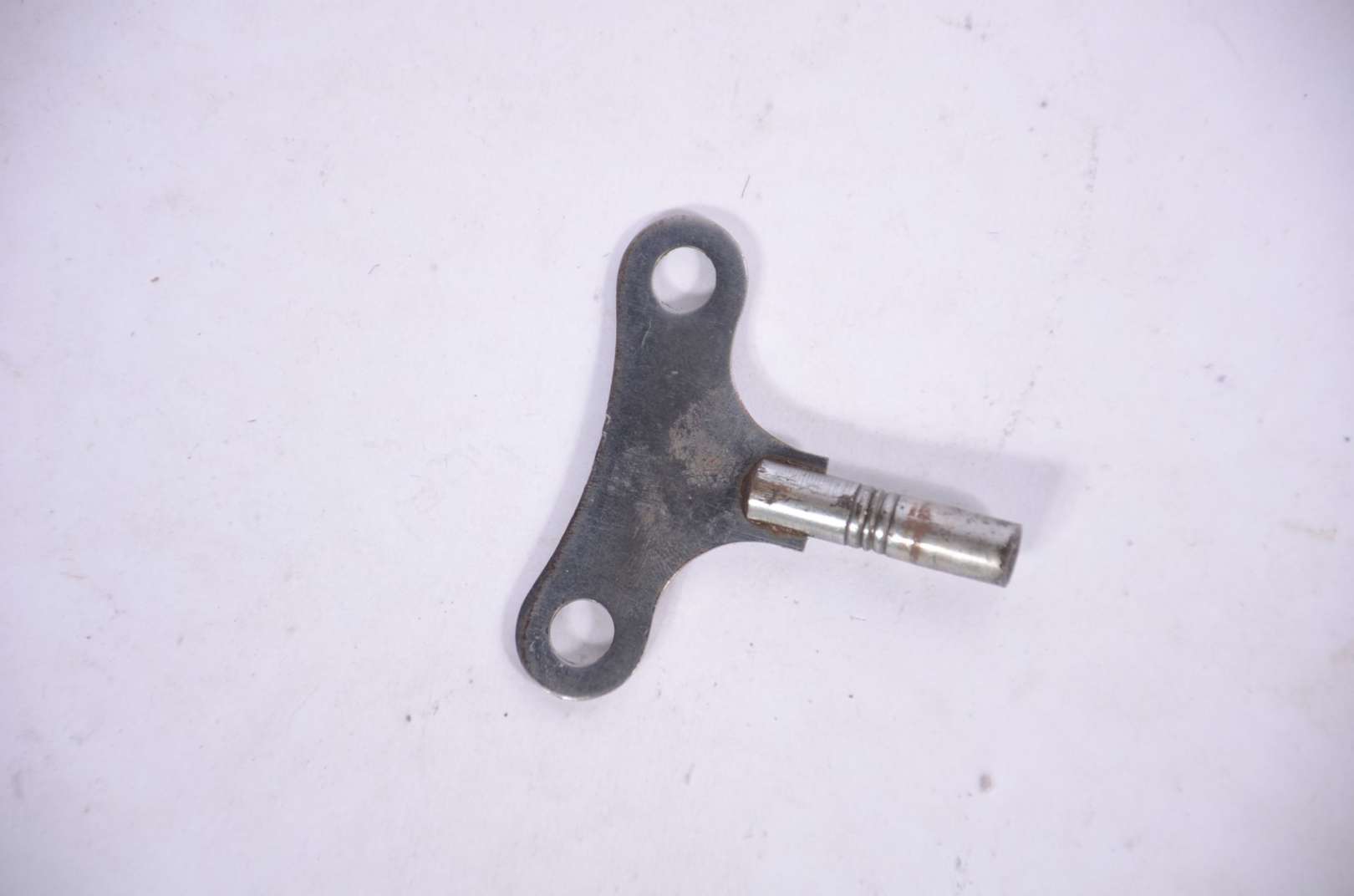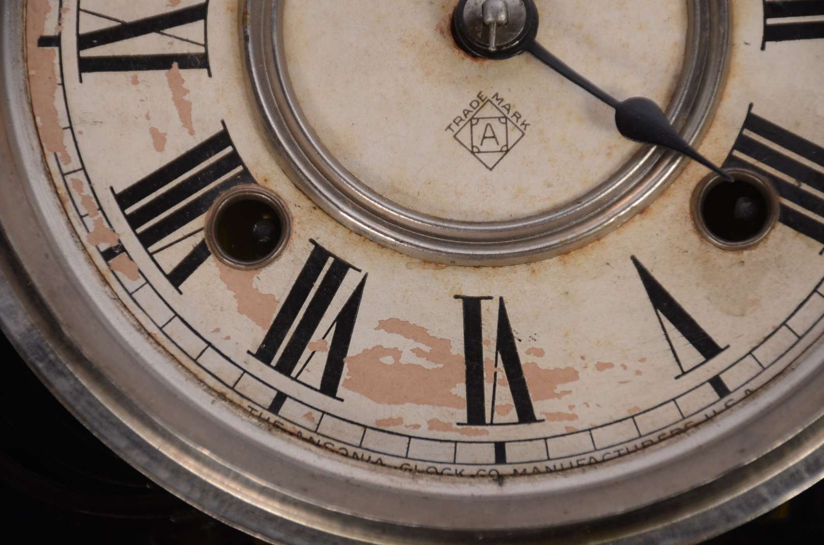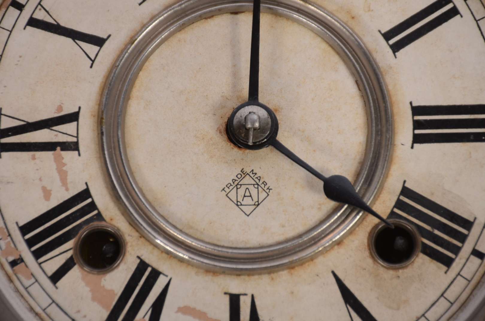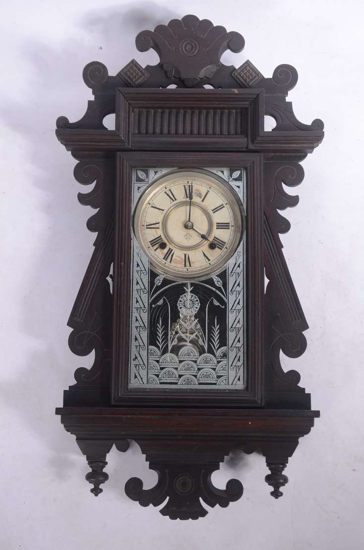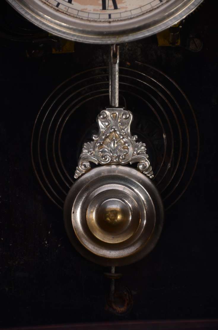 Relógio de parede feitio "oito", caixa de madeira. Com chave. Mostrador com desgastes. Funcionando.