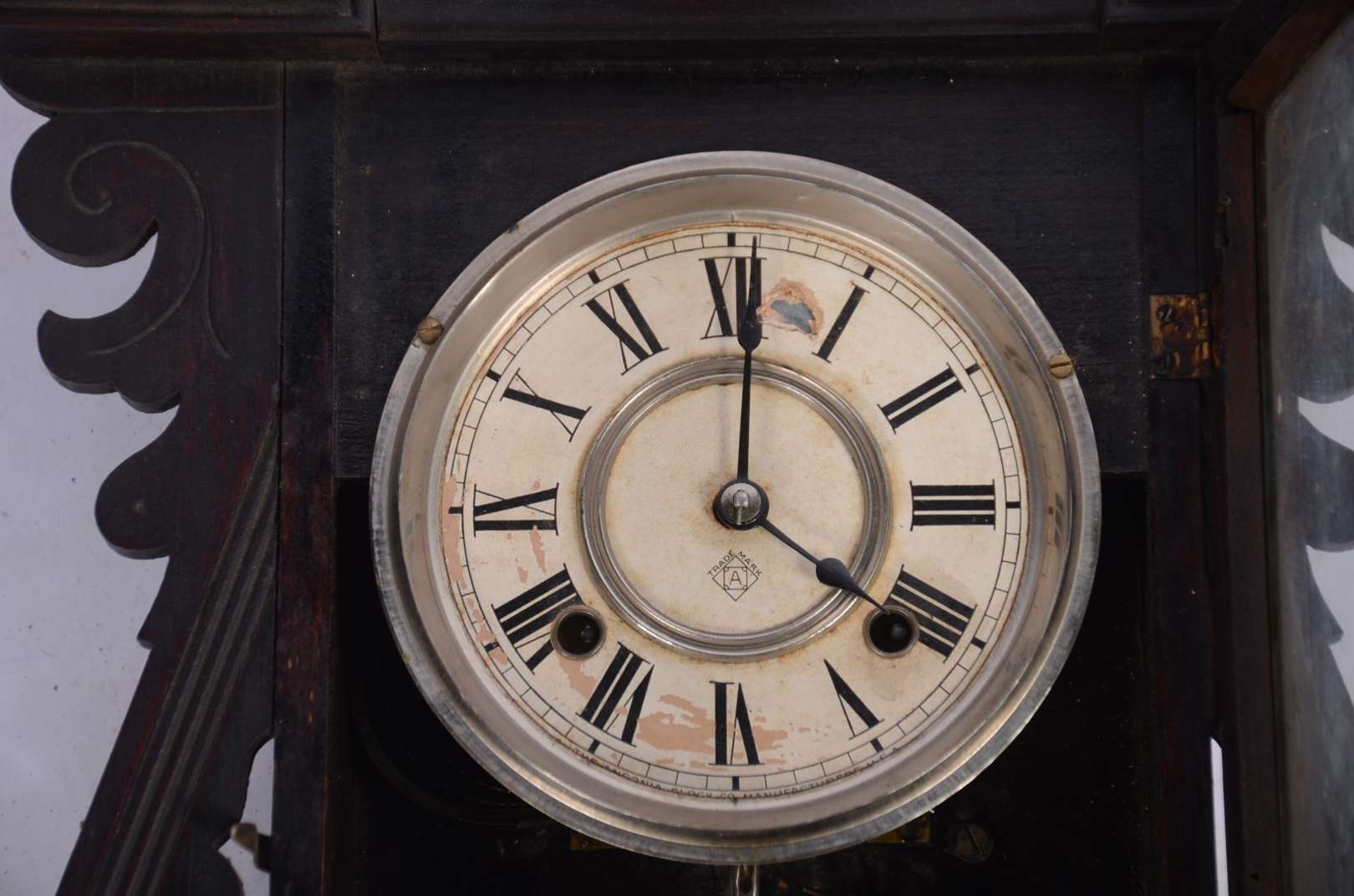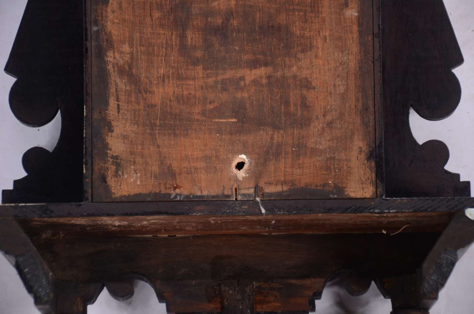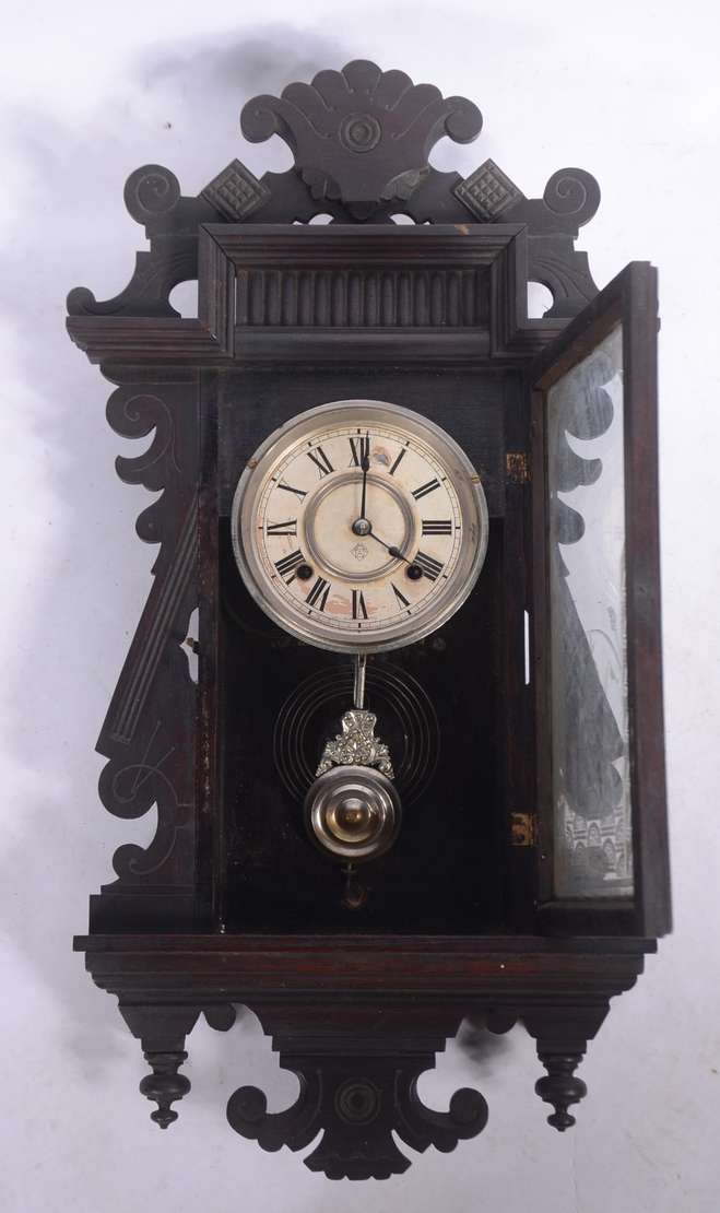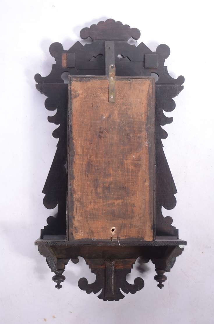 Relógio de parede feitio capelinha, caixa de madeira entalhada.