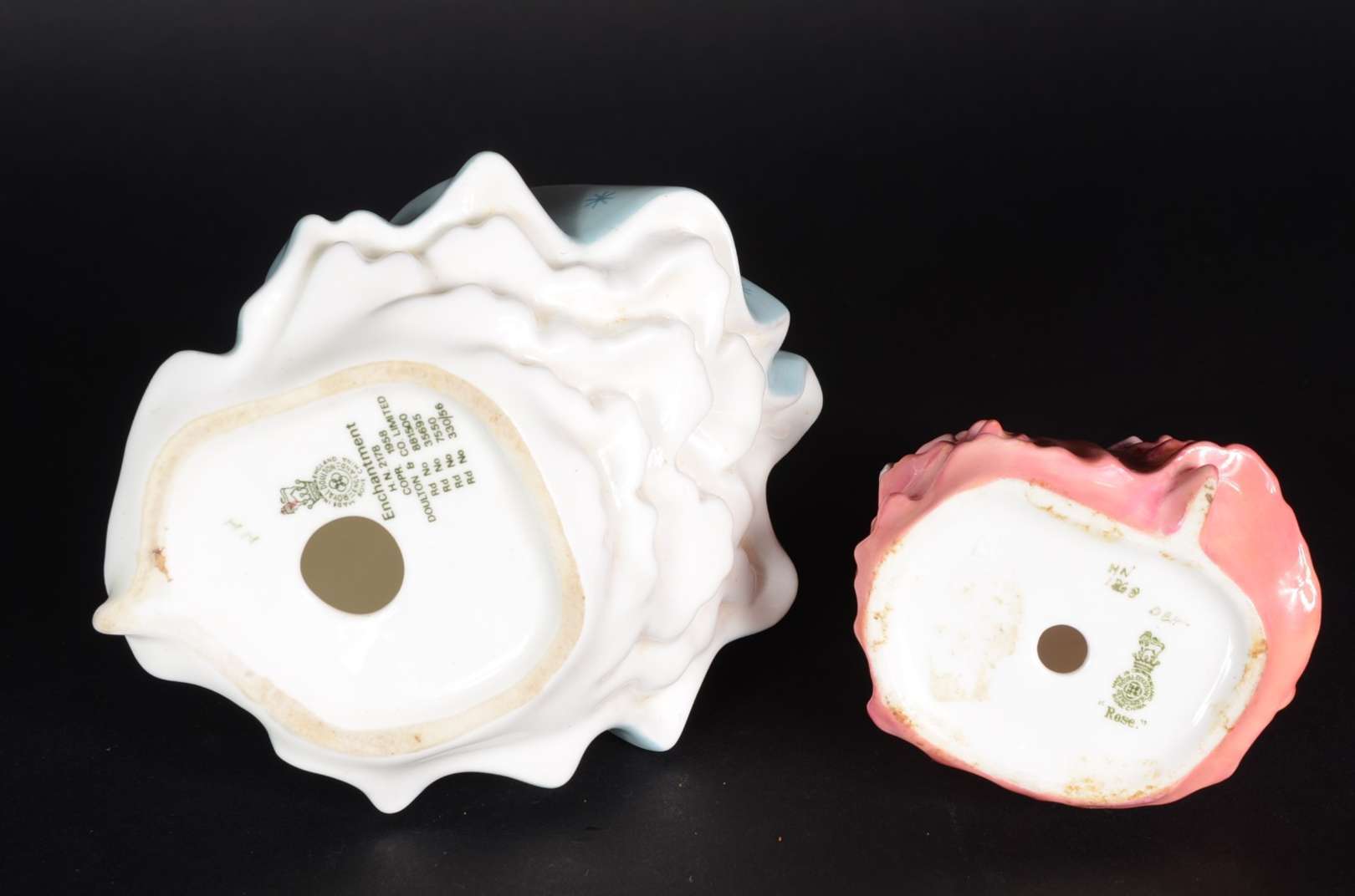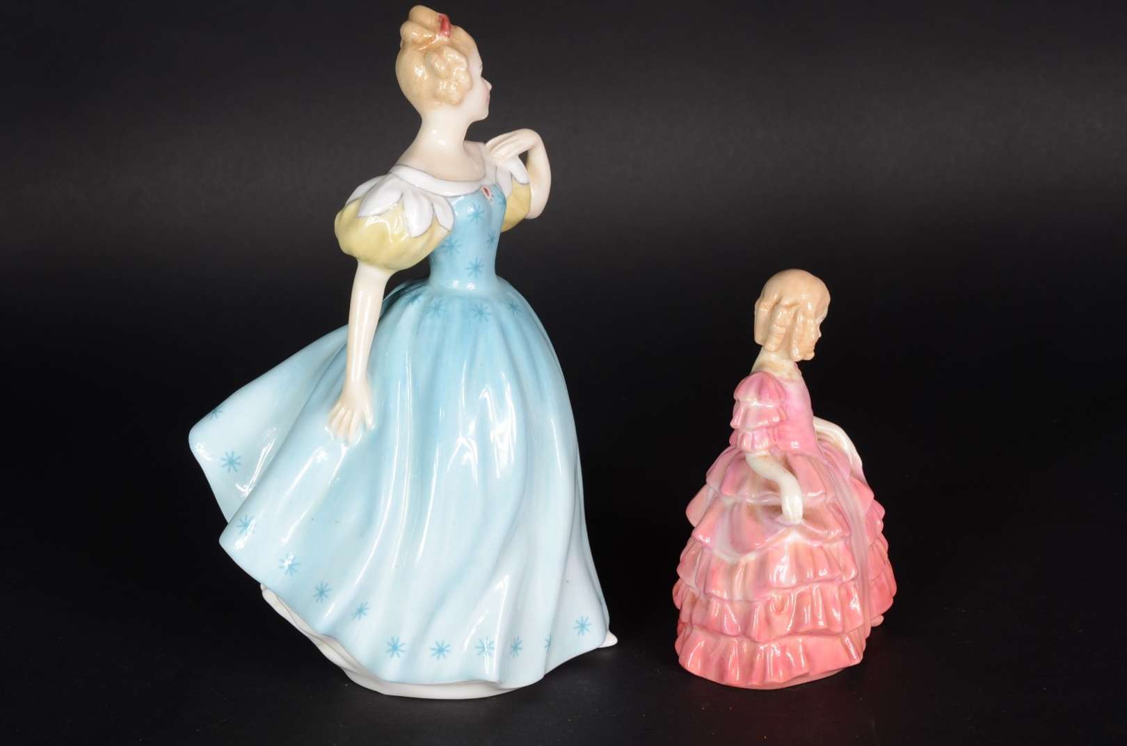 Duas esculturas de porcelana Royal Doulton policromada representando moças.