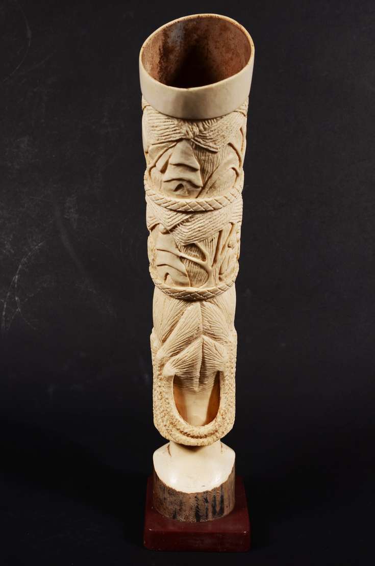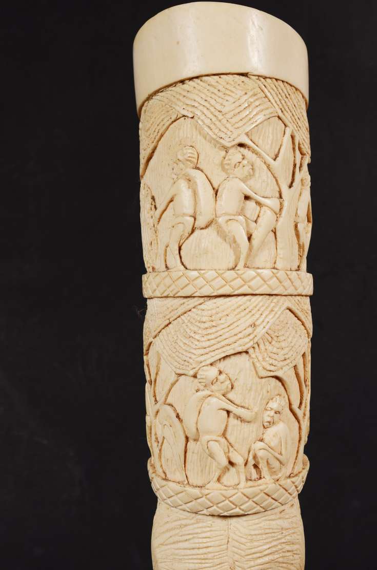 Grupo escultórico de marfim representando figuras típicas orientais, base de madeira. Altura total: 20 cm.