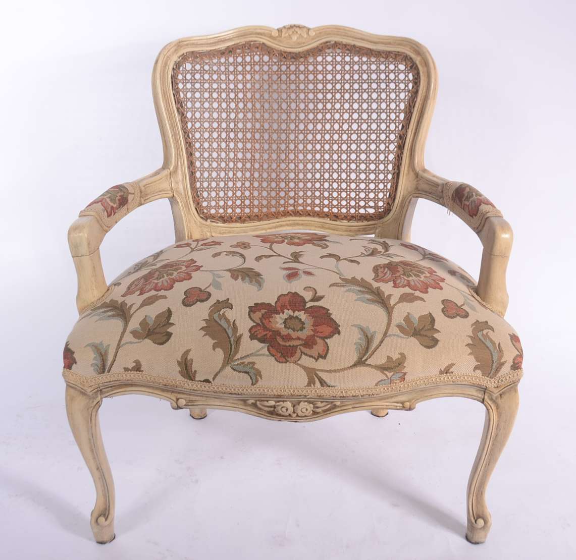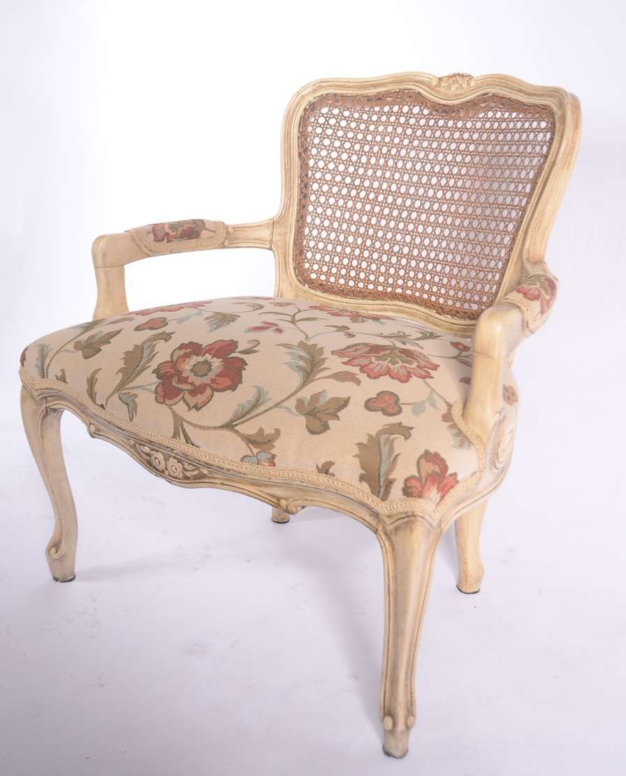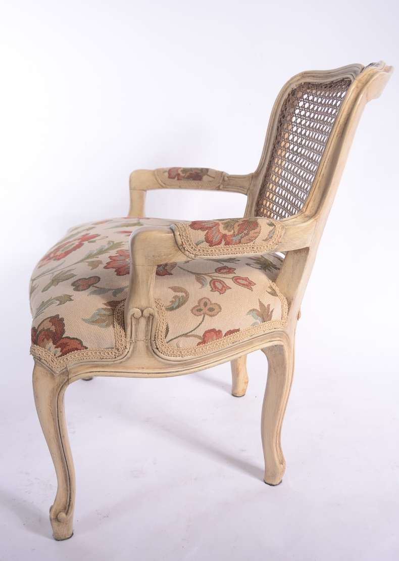 Cadeira de madeira nobre patinada, estilo Luis XV, assento estofado e forrado com tecido floral, encosto de palhinha.