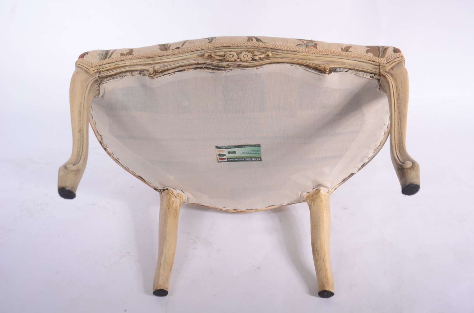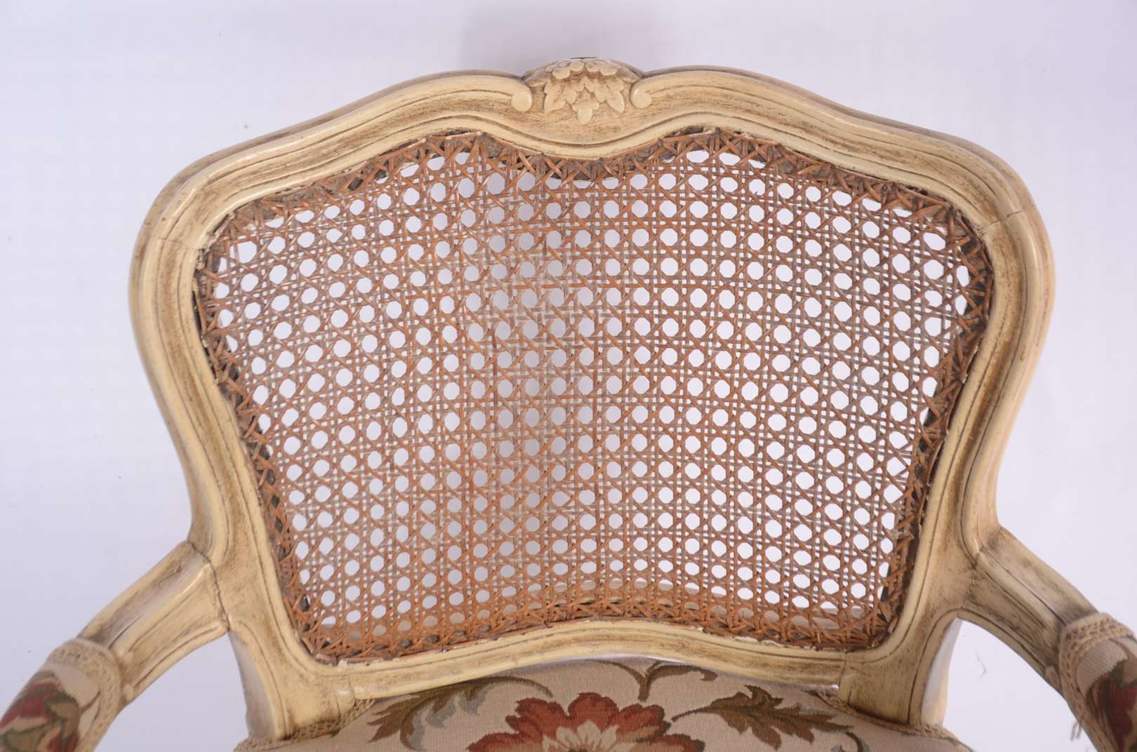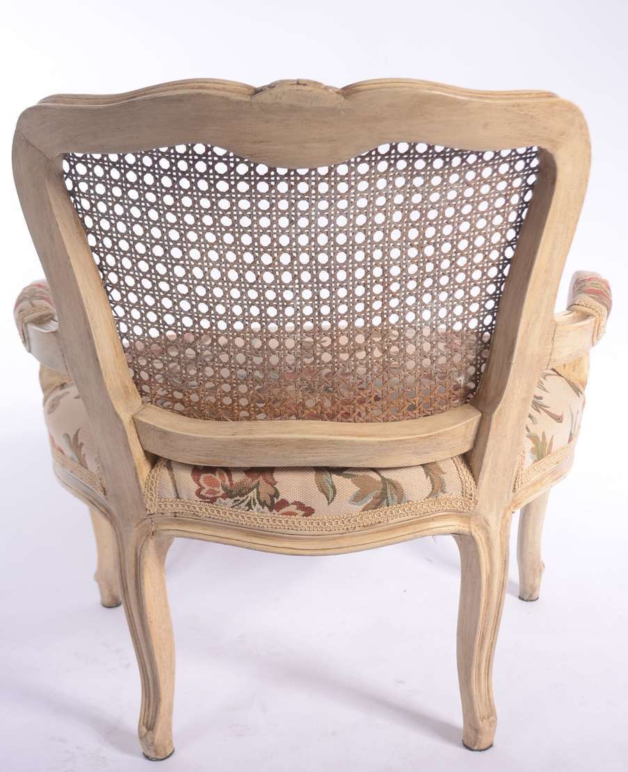 Cadeira de madeira nobre patinada, estilo Luis XV, assento estofado e forrado com tecido floral, encosto de palhinha.