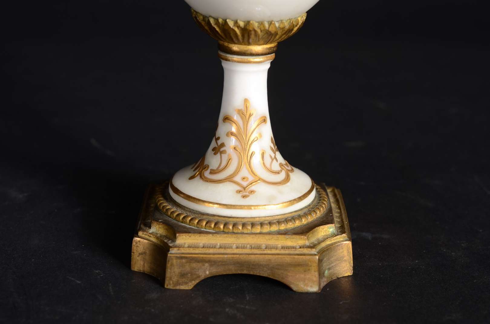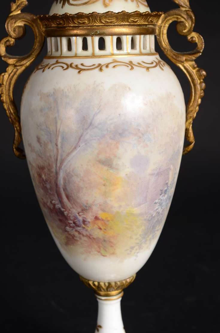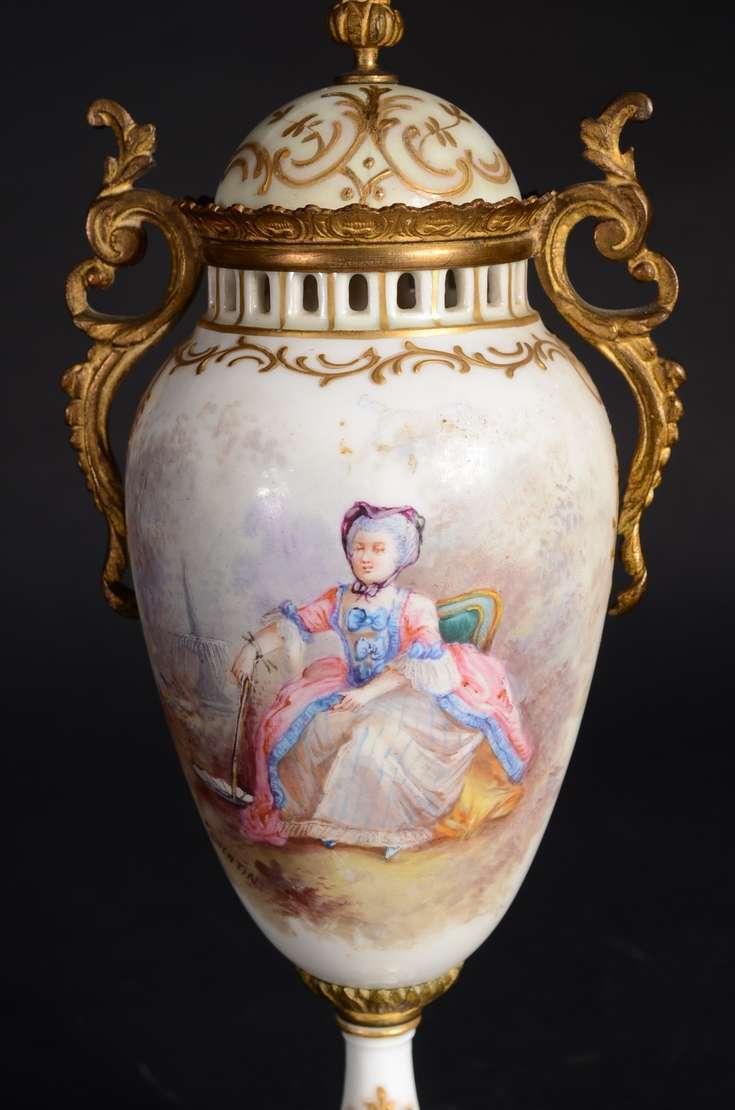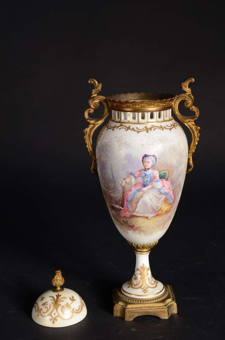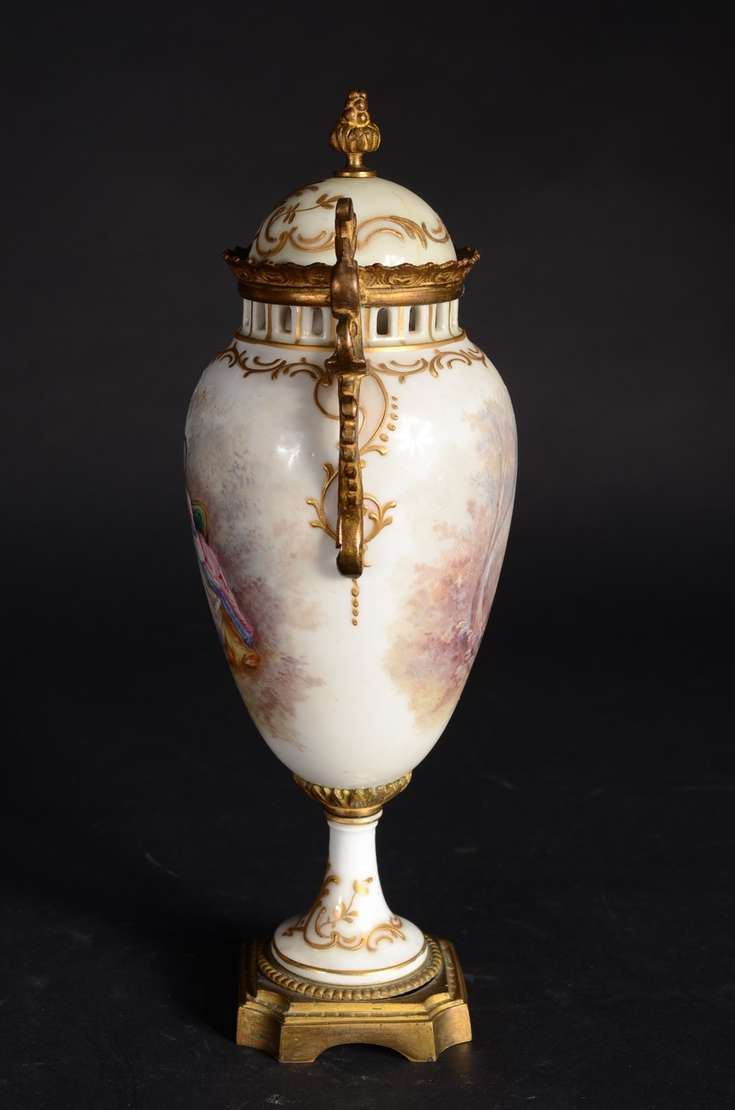Par de ânforas de faiança branca, guarnição de metal.