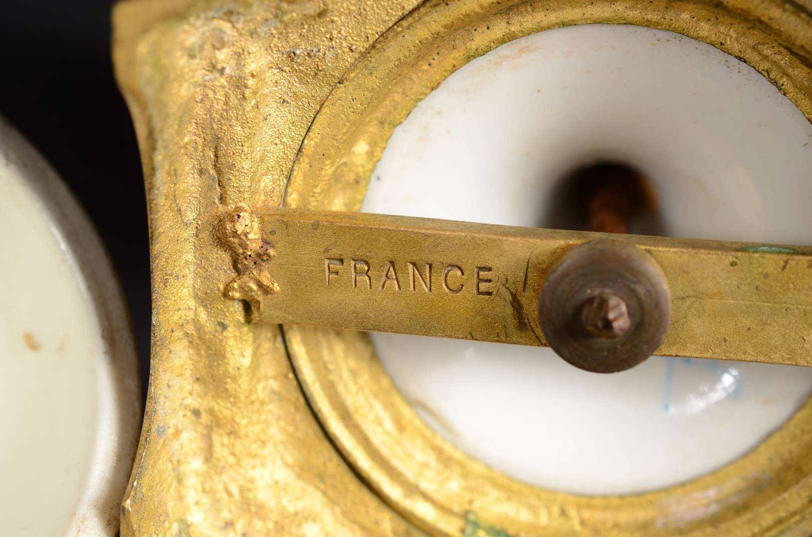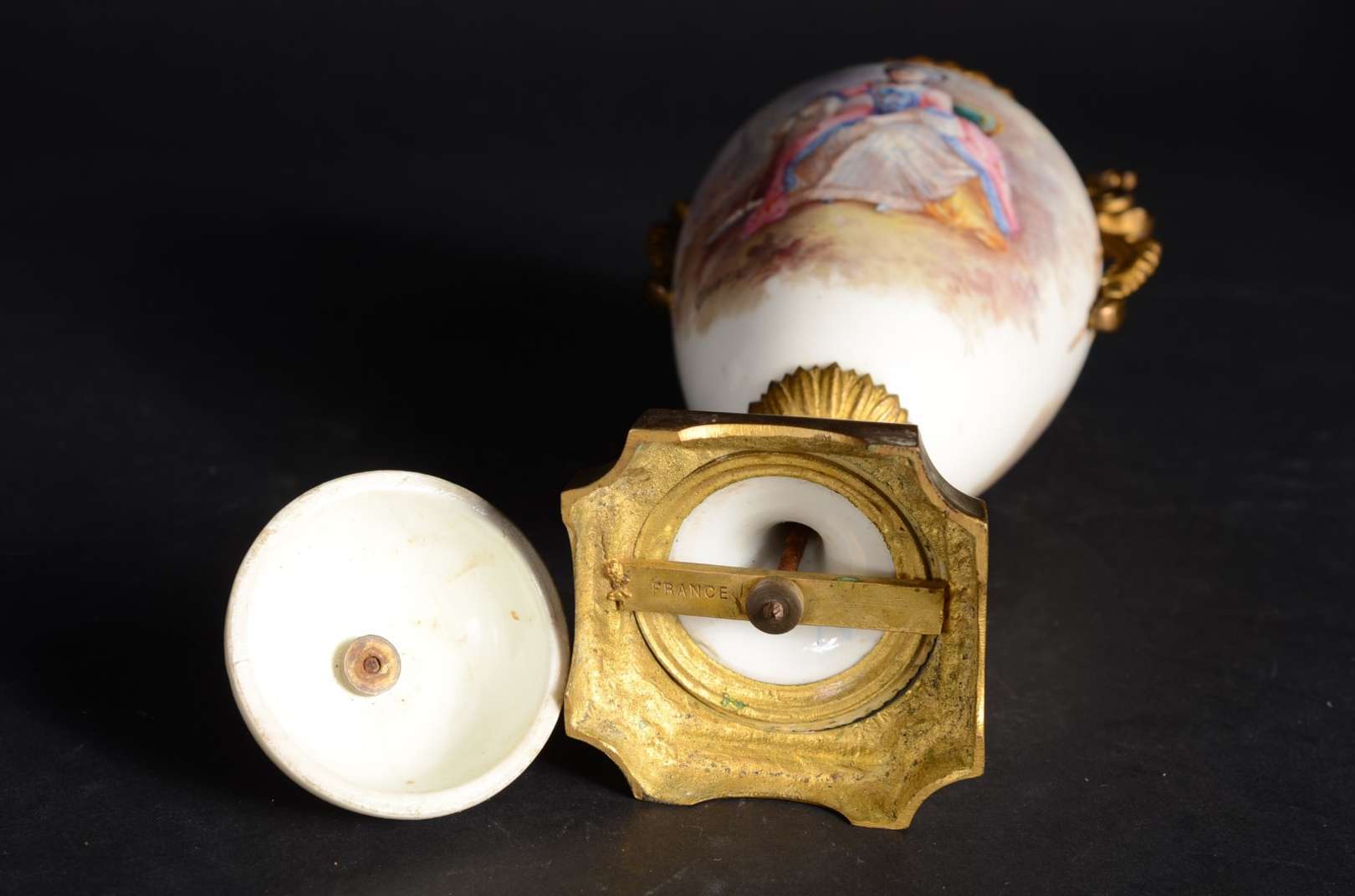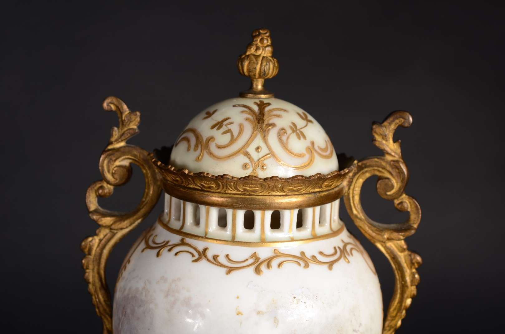 Par de ânforas de faiança branca, guarnição de metal.