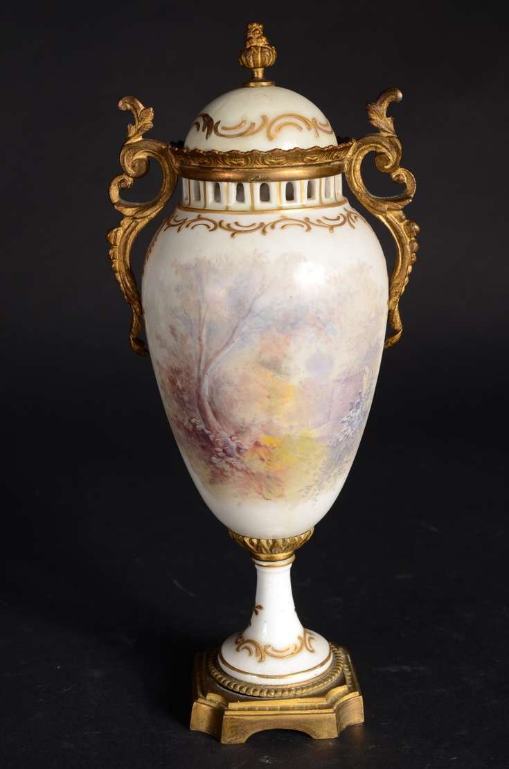 Vaso de bronze dourado Art Nouveau, decorado com paisagem costeira circundante com um menino alimentando duas garças ...
