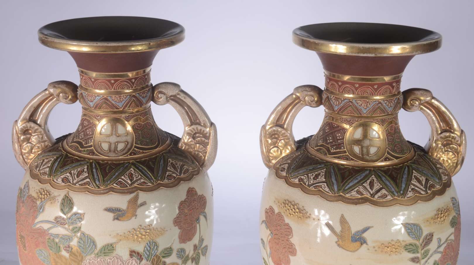 Par de vasos de cerâmica portuguesa decorados com flores em policromia. Um com fio de cabelo na borda. Desgastes.